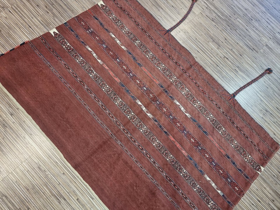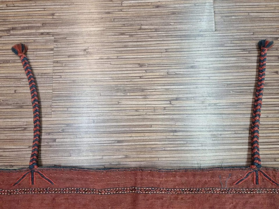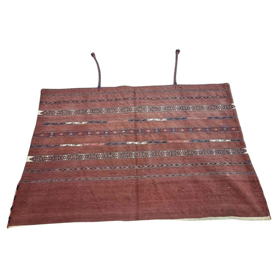 Handmade Antique Turkmen Sumak Salt Bag ? 2.6' x 3.8' ? 1880s This rare antique Turkmen Sumak salt bag, dating back to the 1880s, is a remarkable example of traditional Turkmen craftsmanship. Handwoven with 100% high-quality wool, this flatwoven textile features striking geometric patterns, characteristic of authentic tribal artistry. Originally used by nomadic Turkmen tribes for storing and transporting salt, this handmade textile holds both historical and functional significance. Its rich color palette and bold motifs make it a standout piece in any vintage or bohemian-inspired setting. Key Features ? Origin: Handmade Turkmen Sumak salt bag, Turkmen region (1880s)? Material: 100% high-quality wool ? Durable and naturally dyed? Technique: Flatwoven Sumak weaving ? A traditional Turkmen technique? Design: Classic Turkmen geometric motifs? Historical Significance: Originally crafted for nomadic use? Condition: Good antique condition Natural wear consistent with age Minor signs of use that add character? Versatile Usage: Perfect as a unique decorative piece Ideal for collectors of antique textiles Great for vintage, bohemian, or tribal decor? Authenticity: Guaranteed handmade ? Not machine-made Dimensions of Handmade Antique Turkmen Sumak Salt Bag ? Length: 116 cm (3.8 ft)? Width: 79 cm (2.6 ft) Why You?ll Love It ? Authentic Antique Textile ? A true 1880s Turkmen artifact, rich in history and tradition? Timeless Tribal Elegance ? Geometric motifs and earthy tones enhance any interior? Rare Collectible ? An exceptional find for those who appreciate antique textiles? Versatile Decor Piece ? Functions as wall art, table decor, or a unique textile accent? Museum-Quality Craftsmanship ? Reflects centuries of Turkmen weaving heritage Whether you?re a collector of rare textiles, an interior design enthusiast, or someone who values historic handmade pieces, this antique Turkmen Sumak salt bag is a beautiful fusion of art, history, and function. Don?t miss the opportunity to own this unique antique textile treasure!