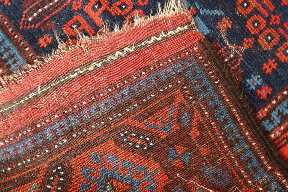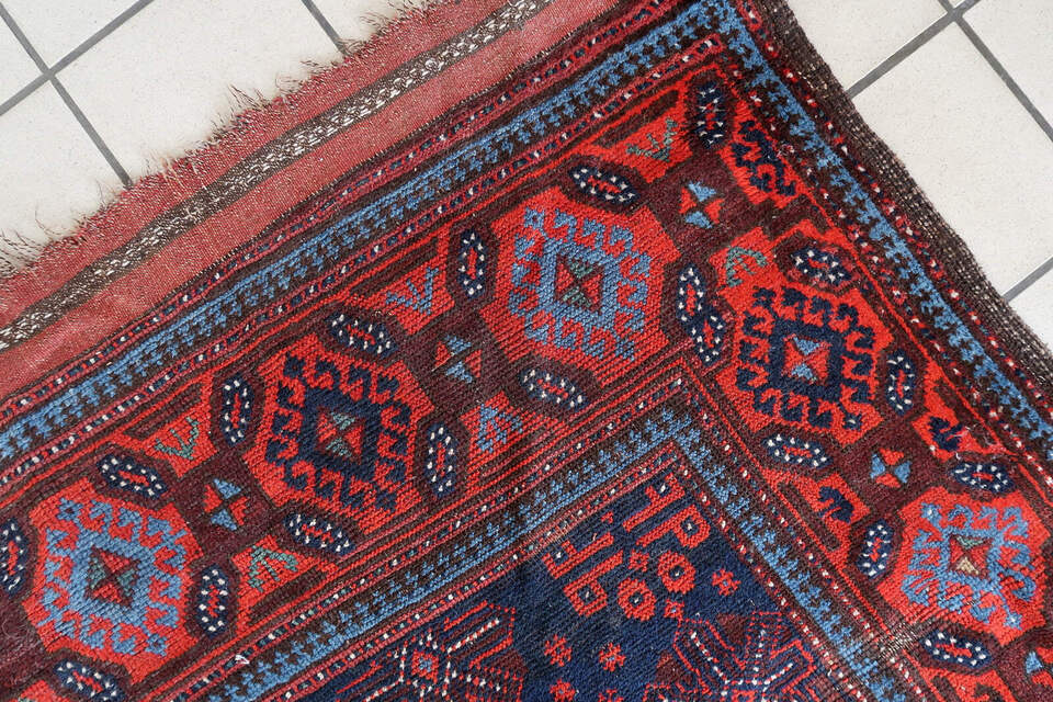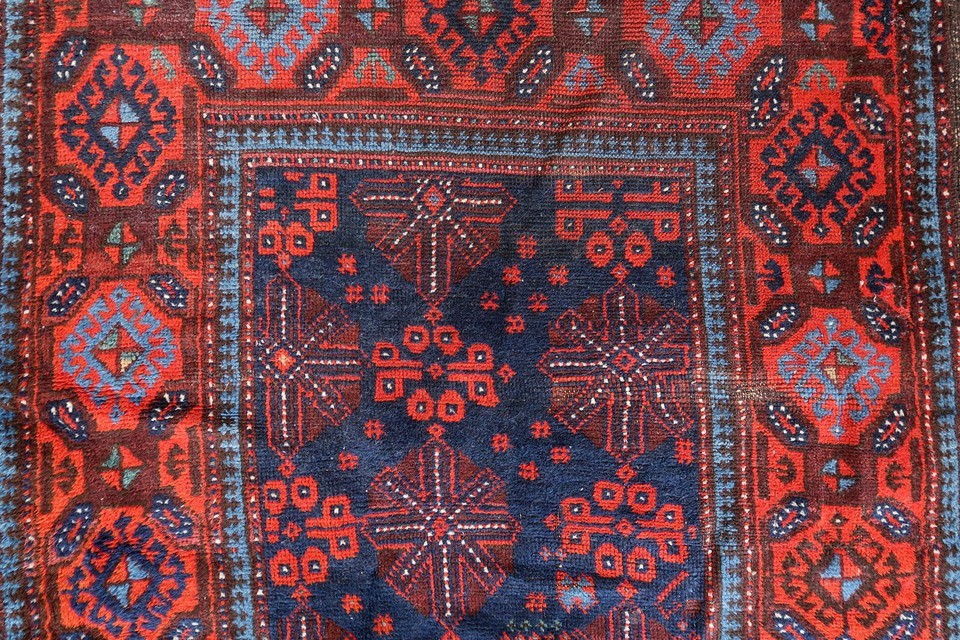 Handmade Antique Afghan Baluch Rug ? 3.1' x 7.1' ? 1880s Wool Runner Own a rare piece of history with this handmade antique Afghan Baluch rug, dating back to the 1880s. Measuring 3.1 feet x 7.1 feet (95 cm x 219 cm), this exquisite wool runner embodies the rich tradition of Afghan craftsmanship, featuring intricate geometric patterns and a striking color palette. This authentic Baluch rug showcases deep blues, vibrant reds, and lighter blue and white accents, creating a visually captivating and timeless design. The hand-knotted wool construction ensures durability and resilience, while the fringed edges add an elegant touch, highlighting the meticulous craftsmanship of this unique piece. With some low pile in certain areas, this rug retains its vintage charm while remaining sturdy and functional. Whether placed in a living room, hallway, bedroom, or entryway, this antique Afghan Baluch rug will enhance any space with its historical significance and artistic beauty. Key Features ? Origin: Handmade in Afghanistan? Material: 100% Wool? Construction: Hand-knotted by skilled artisans? Design: Traditional Afghan geometric patterns with intricate detailing? Color Palette: Deep blues, vibrant reds, and lighter accents? Era: Circa 1880s? Condition: Good; some low pile in a few areas, consistent with age? Fringe Detail: Decorative fringed edges for added elegance Dimensions of Handmade Antique Afghan Baluch Rug ? Length: 7.1 feet (219 cm)? Width: 3.1 feet (95 cm) ? Material Weight: Durable wool pile for longevity Why You?ll Love This Rug ? Authentic Antique Piece ? A genuine 1880s Afghan Baluch rug, rich in history and tradition? High-Quality Wool ? Naturally soft, durable, and resistant to wear? Versatile Timeless ? Perfect for hallways, living spaces, or as a collector?s piece? Investment-Worthy ? Antique rugs increase in value over time? Ready to Use ? Good vintage condition, making it a functional and decorative heirloom This rare Afghan Baluch rug is a true collector?s piece, ideal for antique rug enthusiasts, interior designers, and lovers of fine craftsmanship. Don?t miss the chance to own an authentic piece of 19th-century textile art!