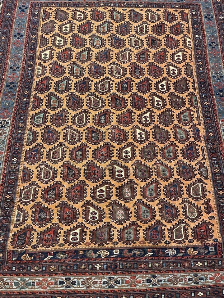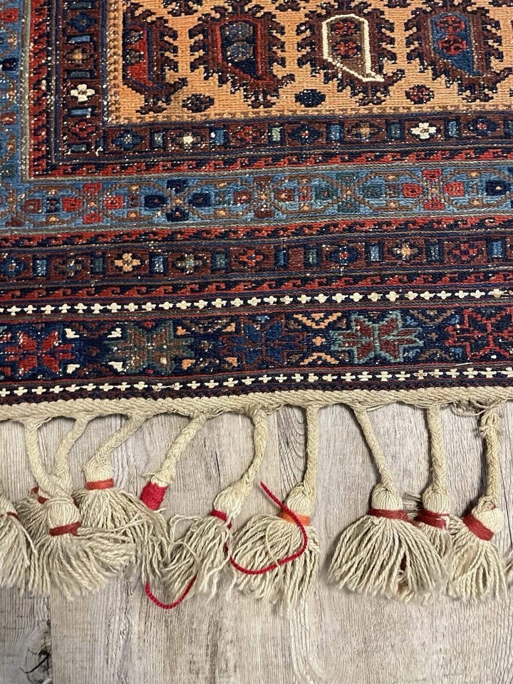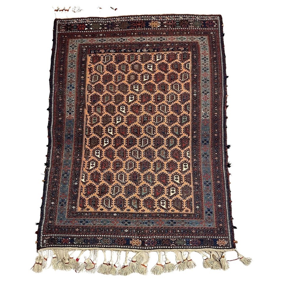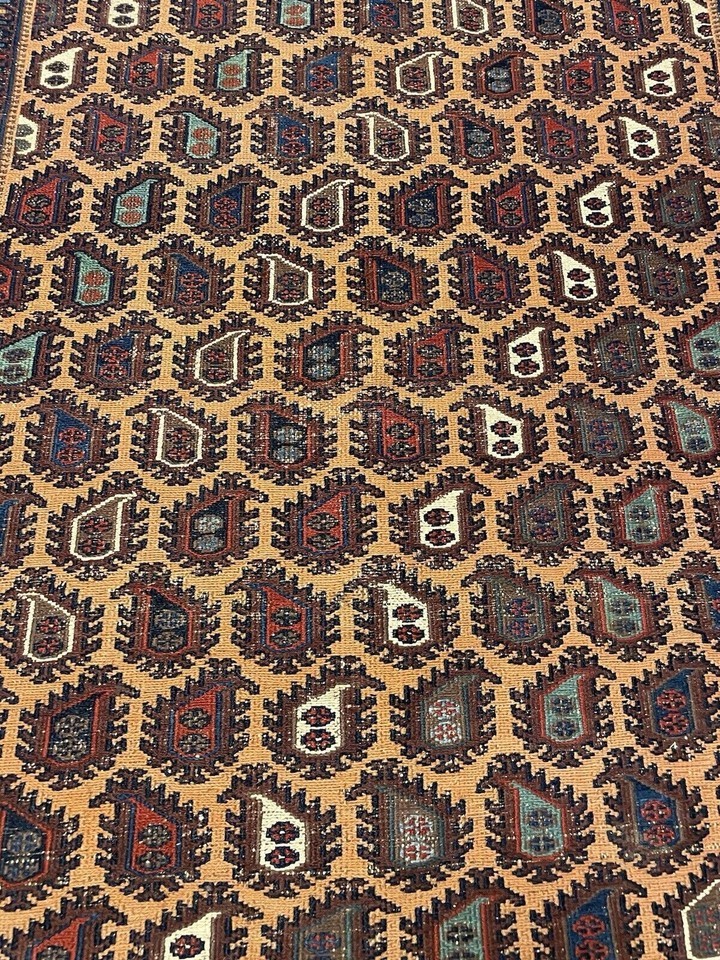 Antique Handmade Afghan Sumak Rug ? A Unique Collector?s Find Step into the world of Afghan weaving traditions with this stunning handmade antique Sumak rug from the 1920s. Known for its flatweave technique, this piece features an intricate geometric design in a rich color palette of red, blue, and brown. Measuring 3.6 ft x 4.8 ft (109 cm x 146 cm), it is a versatile and timeless addition to any home or collection. This antique Sumak rug stands out for its low pile texture, which gives it a distinct woven appearance. The original tassels add an extra touch of authenticity, while the natural signs of age enhance its historical charm. Timeless Design Craftsmanship The Sumak weaving technique creates a durable and lightweight rug with a tight, tapestry-like structure. The detailed geometric motifs symbolize protection, strength, and nomadic heritage, reflecting the artistry and skill of Afghan weavers. The harmonious blend of warm earthy hues makes it a versatile piece that complements both modern and traditional interiors. Whether displayed as a floor covering or wall tapestry, this rug will elevate any space with its antique charm. A Rare Collectible Piece Handwoven over a century ago, this rug is more than just decor?it?s a piece of history. Its authentic design, age, and craftsmanship make it a highly desirable addition for antique collectors, rug enthusiasts, and interior designers alike. Key Details of Handmade Sumak wool rug: ? Dimensions: 3.6 ft x 4.8 ft (109 cm x 146 cm)? Material: 100% Wool ? Durable Soft? Weaving Technique: Handwoven Sumak Flatweave? Age: Circa 1920s (Over 100 Years Old!)? Origin: Afghanistan ? Traditional Tribal Weaving? Design: Geometric Tribal Patterns with Tassel Accents? Color Palette: Rich Red, Deep Blue, and Earthy Brown Tones? Condition: Low Pile with Visible Signs of Age? Versatile Use: Ideal as a Floor Rug, Wall Hanging, or Collector?s Item This handmade Afghan Sumak rug is an extraordinary piece of history and artistry. Its authentic craftsmanship, intricate design, and cultural significance make it a timeless treasure. ? Don?t miss the chance to own this rare antique rug?order now!