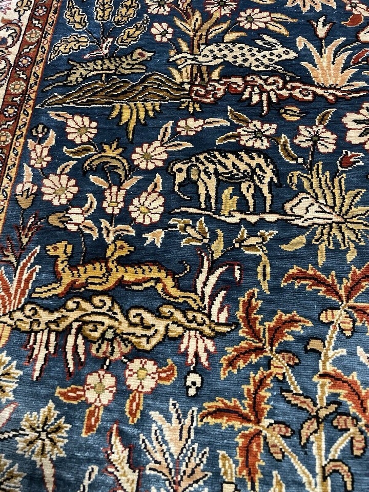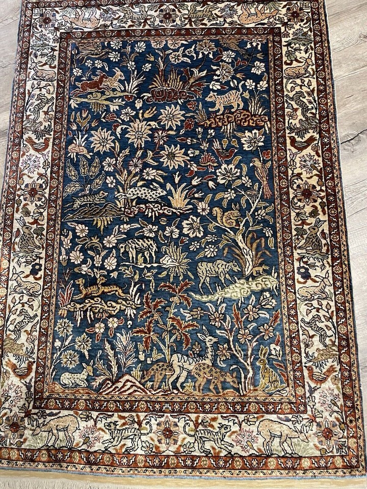? HANDMADE VINTAGE HEREKE SILK RUG - 1970s ? ? Indulge in pure luxury with this exquisite handmade Turkish Hereke silk rug from the 1970s! ? Renowned for their exceptional craftsmanship, Hereke rugs are highly sought after for their intricate detailing, fine silk weave, and artistic motifs. ?? This stunning piece showcases a mesmerizing array of floral patterns intertwined with enchanting animal motifs, including birds, deer, and rabbits, all set against a rich dark blue background. ??? The delicate yet striking border frames the design beautifully, adding a refined elegance. The soft silk texture enhances its luxurious appeal, making it a perfect centerpiece for any sophisticated space. Measuring 76 cm x 110 cm (2.5 ft x 3.6 ft), this rug is in good condition, with only minimal signs of use. Its hand-knotted silk fibers ensure a soft, luminous sheen, reflecting light in a way that only pure silk can. ? Key Features of Handmade Vintage Turkish Hereke Silk Rug: Type: Handmade Vintage Turkish Hereke Silk Rug ? Size: 76 cm x 110 cm (2.5 ft x 3.6 ft) ? Material: 100% Silk ? Age: 1970s ? Origin: Turkish (Hereke) ?? Design: Floral Animal Motifs ??? Condition: Good (minimal signs of use) ? This masterpiece is ideal for collectors, lovers of fine textiles, and anyone seeking to elevate their home with an elegant, timeless decor piece. Don't miss the opportunity to own a piece of Turkish history! ??