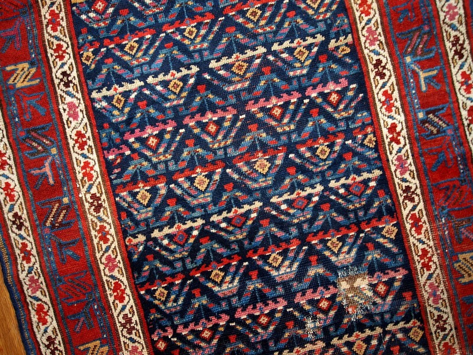 Antique hand made Kurdish distressed runner in dark blue shade. The rug has some age damages and a patch.