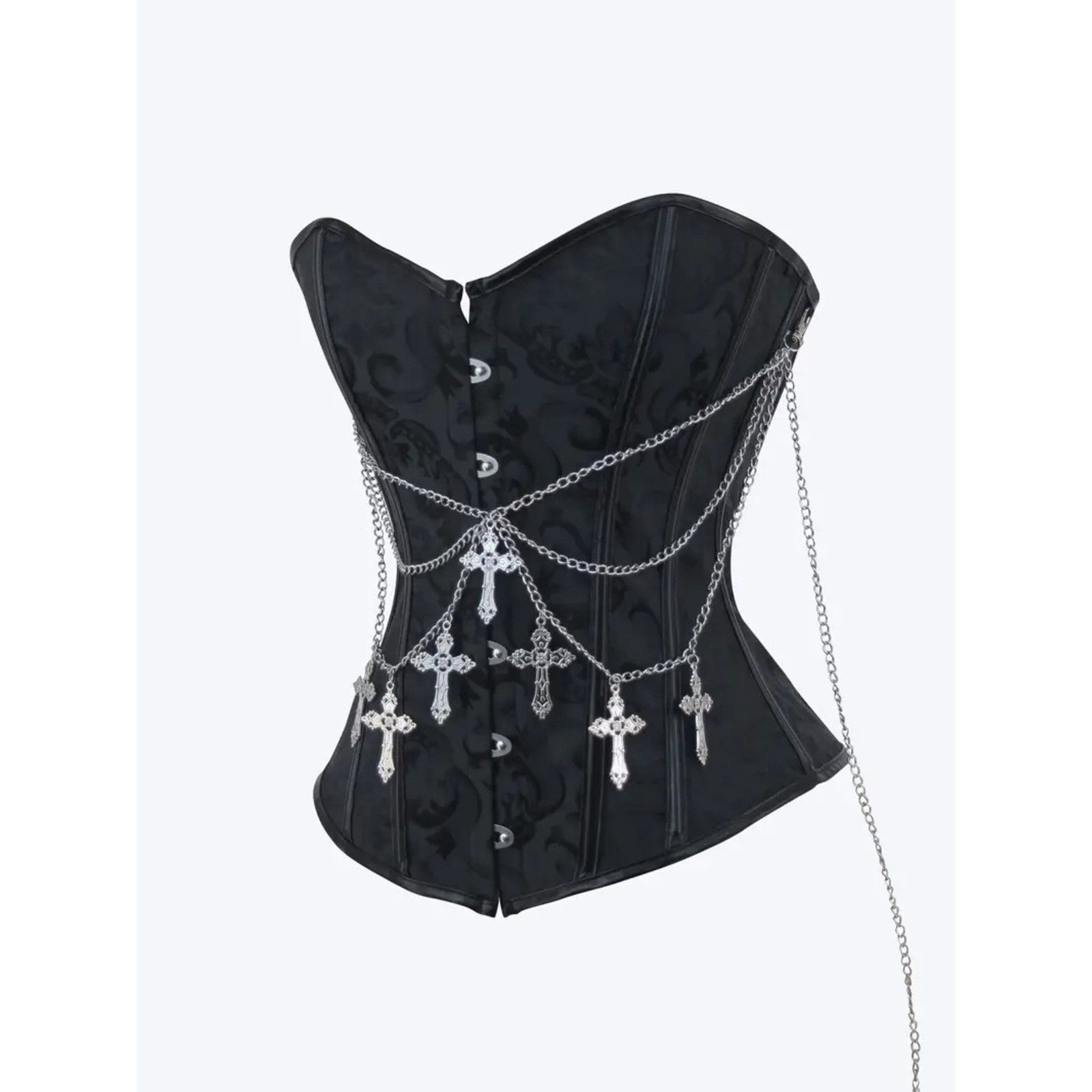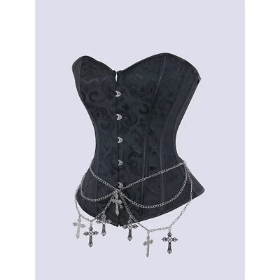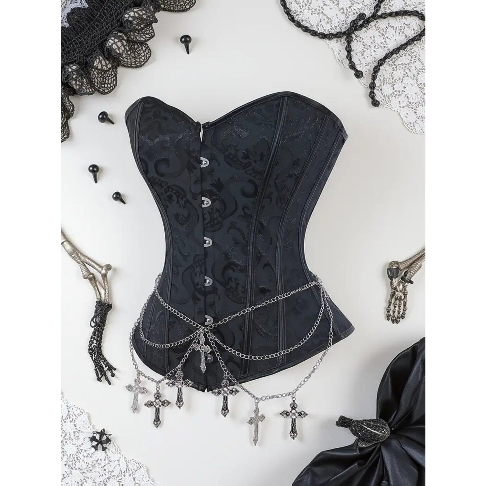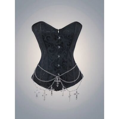 Unleash dark elegance with this Gothic Black Brocade Corset featuring a structured silhouette, ornate jacquard detailing, and dramatic silver cross chain accents. Designed to sculpt your waist with a flattering hourglass fit, this corset is perfect for gothic fashion lovers, alternative aesthetics, or statement cosplay looks.