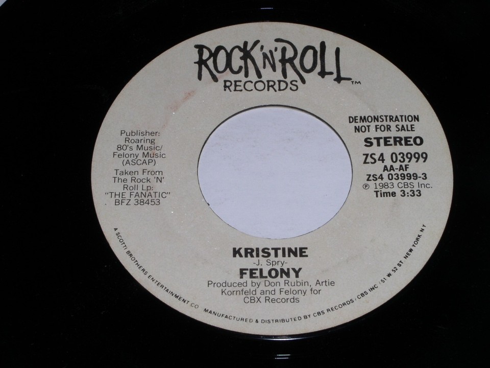 This is a vintage promotional 45 rpm phonograph record by Felony, entitled, "Kristine". Same flipside: "". Record label: Rock N Roll ZS4 03999.