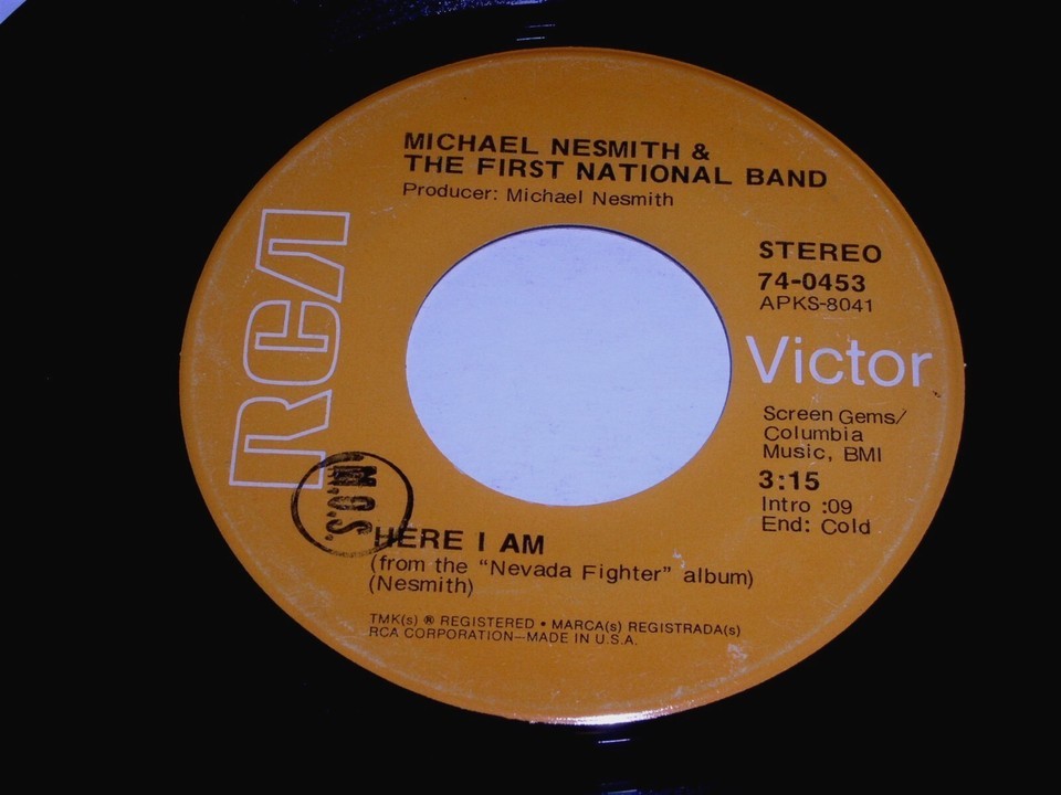 This is the original vintage 45 rpm phonograph record by Michael Nesmith entitled, "Here I Am". Flipside: "Nevada Fighter". Record label: RCA 74-0453.