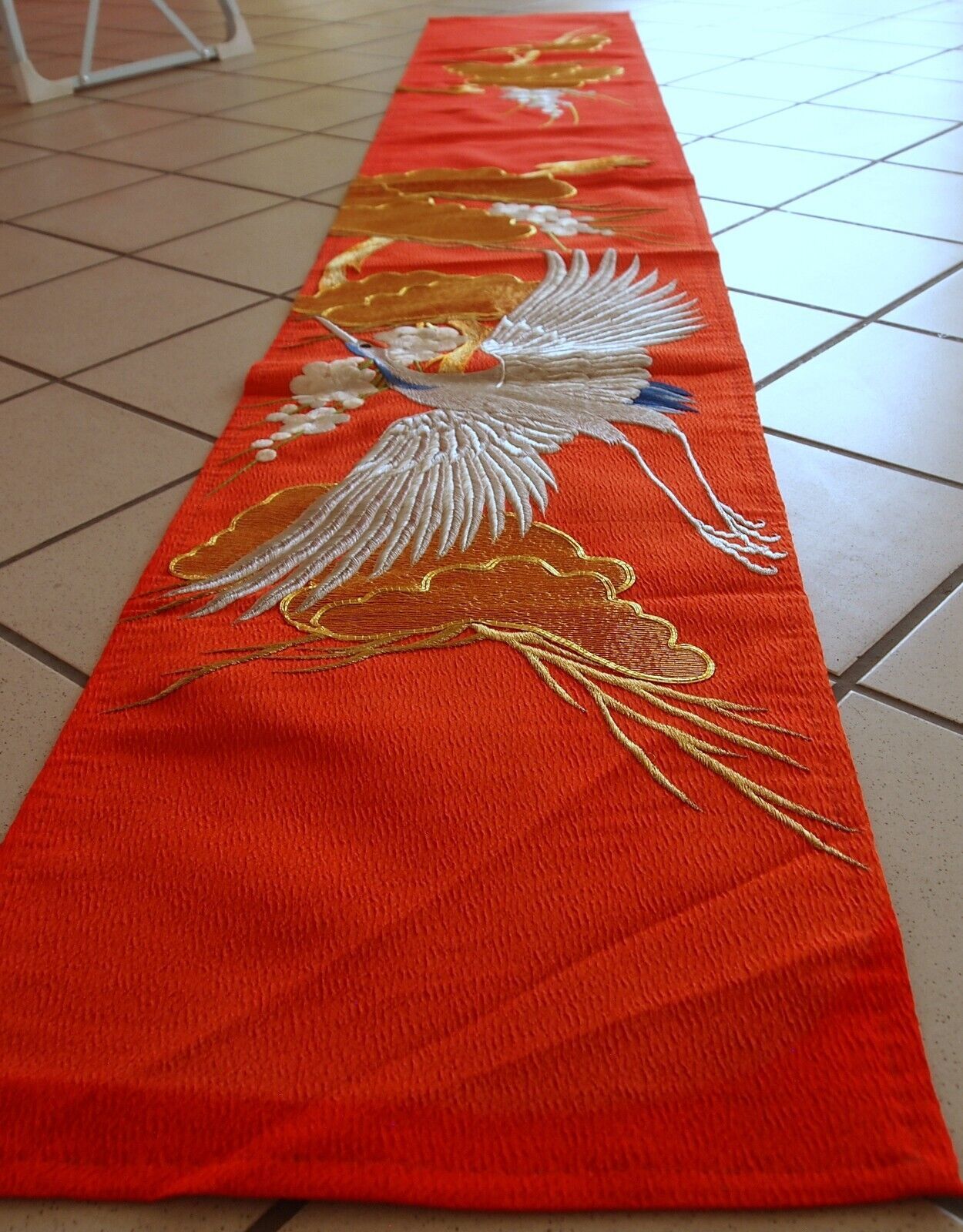 Broderie Murale Vintage Japonaise en Soie ? Annees 1980 ? 1' x 6.9' (32cm x 213cm)