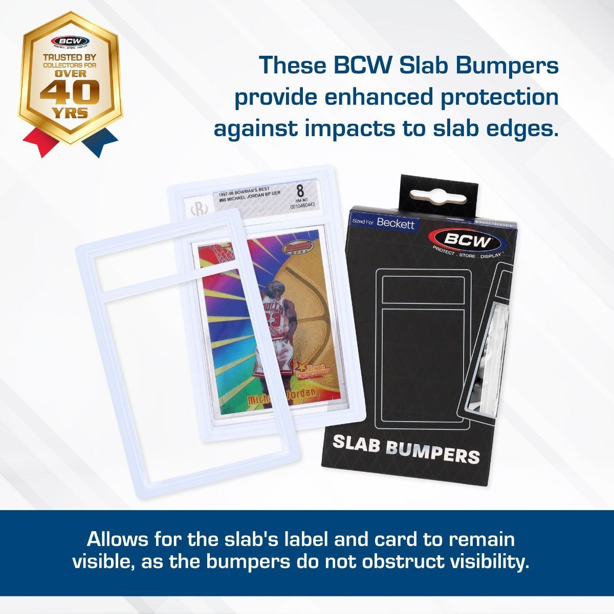 Protect your graded cards from scratches, scuffs, chips, and cracks with BCW Slab Bumpers. These Slab Bumpers are sized to hold the modern, standard-card slabs from Beckett Grading Services (BGS). Slab Bumpers are made from durable thermoplastic elastomers (TPE), which has elastic properties similar to silicone. Insert the BGS slab through the back of the bumper, which is the side with the rounded corners (the BCW logo is on the front).