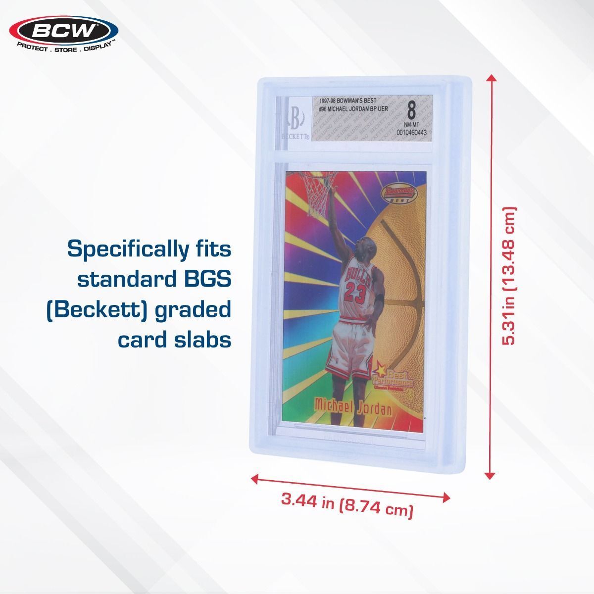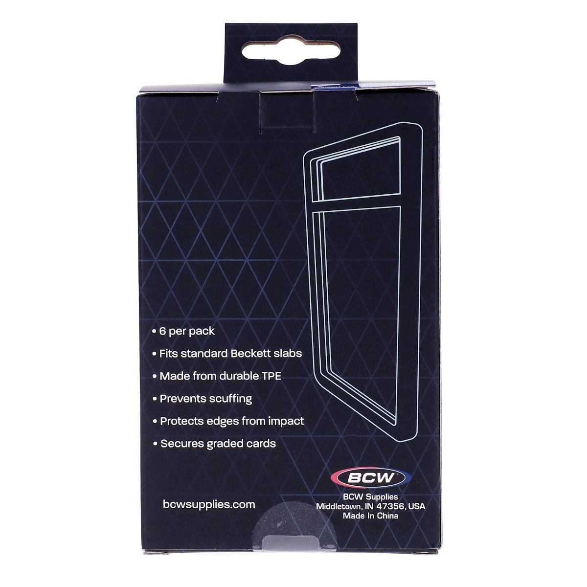 Protect your graded cards from scratches, scuffs, chips, and cracks with BCW Slab Bumpers. These Slab Bumpers are sized to hold the modern, standard-card slabs from Beckett Grading Services (BGS). Slab Bumpers are made from durable thermoplastic elastomers (TPE), which has elastic properties similar to silicone. Insert the BGS slab through the back of the bumper, which is the side with the rounded corners (the BCW logo is on the front).