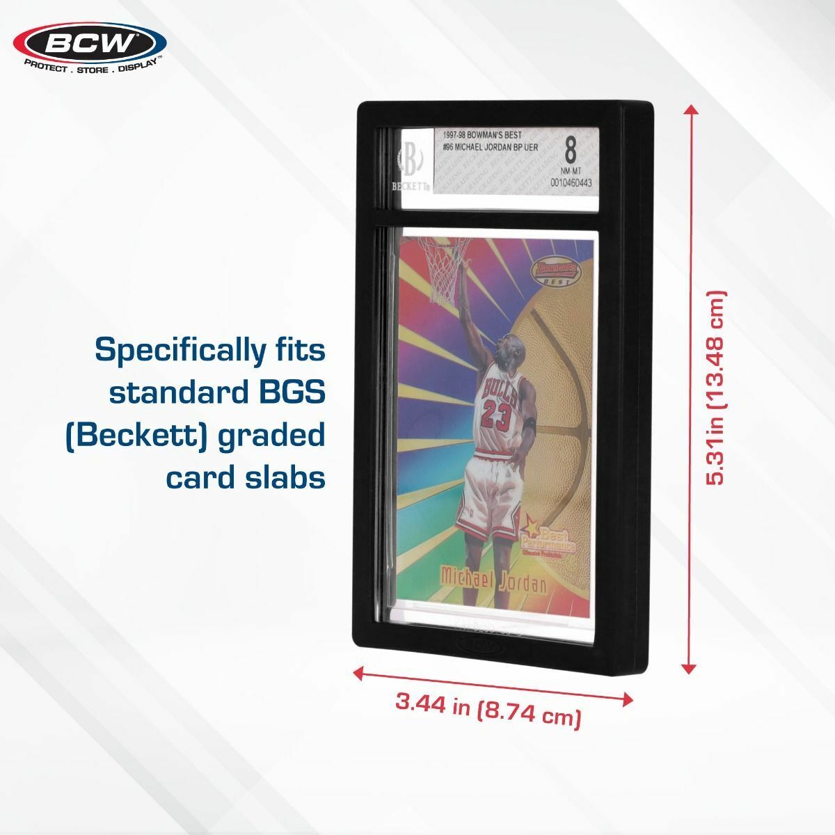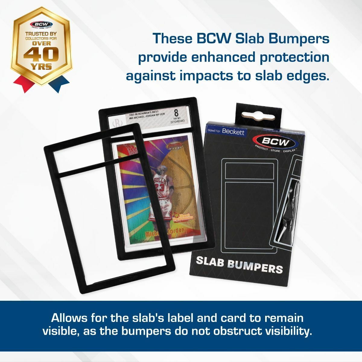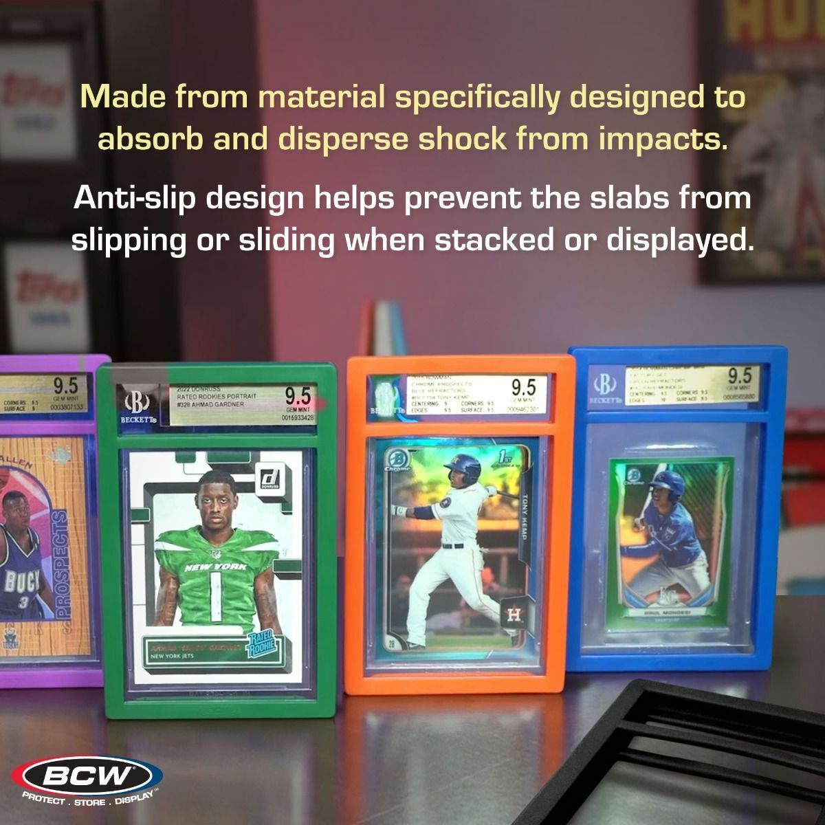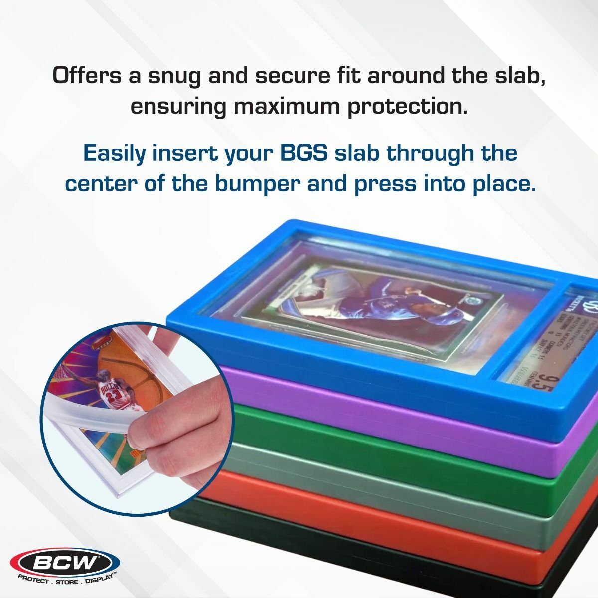 Protect your graded cards from scratches, scuffs, chips, and cracks with BCW Slab Bumpers. These Slab Bumpers are sized to hold the modern, standard-card slabs from Beckett Grading Services (BGS). Slab Bumpers are made from durable thermoplastic elastomers (TPE), which has elastic properties similar to silicone. Insert the BGS slab through the back of the bumper, which is the side with the rounded corners (the BCW logo is on the front).