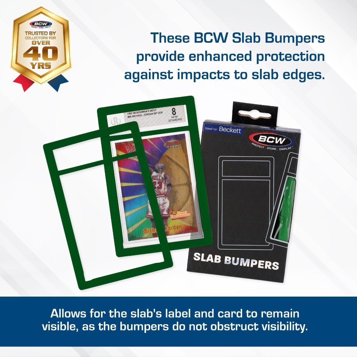 Protect your graded cards from scratches, scuffs, chips, and cracks with BCW Slab Bumpers. These Slab Bumpers are sized to hold the modern, standard-card slabs from Beckett Grading Services (BGS). Slab Bumpers are made from durable thermoplastic elastomers (TPE), which has elastic properties similar to silicone. Insert the BGS slab through the back of the bumper, which is the side with the rounded corners (the BCW logo is on the front).