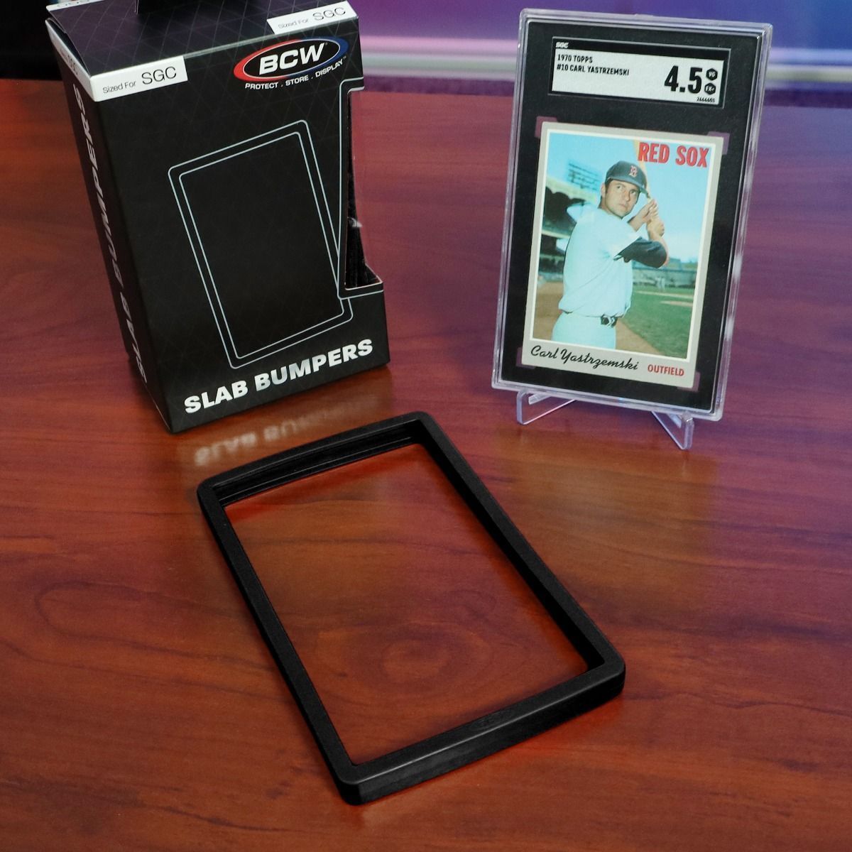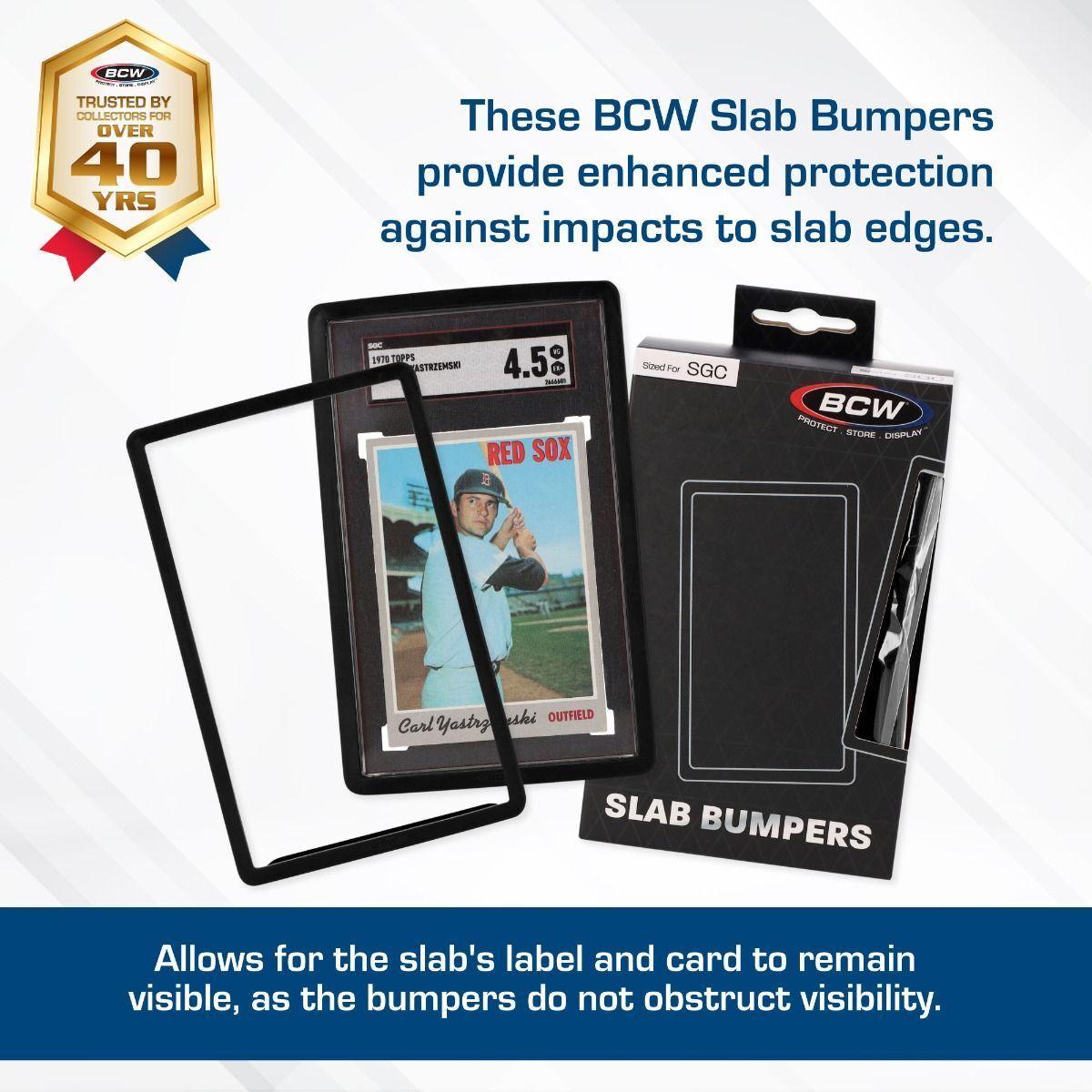 Protect your graded cards from scratches, scuffs, chips, and cracks with BCW Slab Bumpers. These Slab Bumpers are sized to hold the modern, standard-card slabs from Sportscard Guaranty Corporation (SGC). Slab Bumpers are made from durable thermoplastic elastomers (TPE), which has elastic properties similar to silicone. Insert the SGC slab through the back of the bumper, which is the side with the rounded corners (the BCW logo is on the front).
