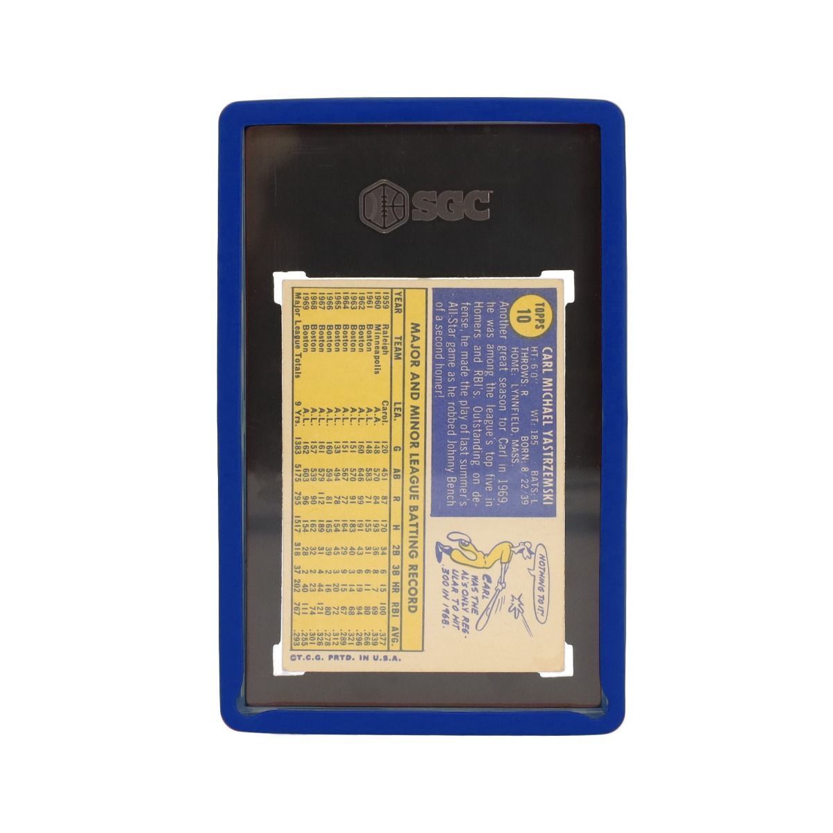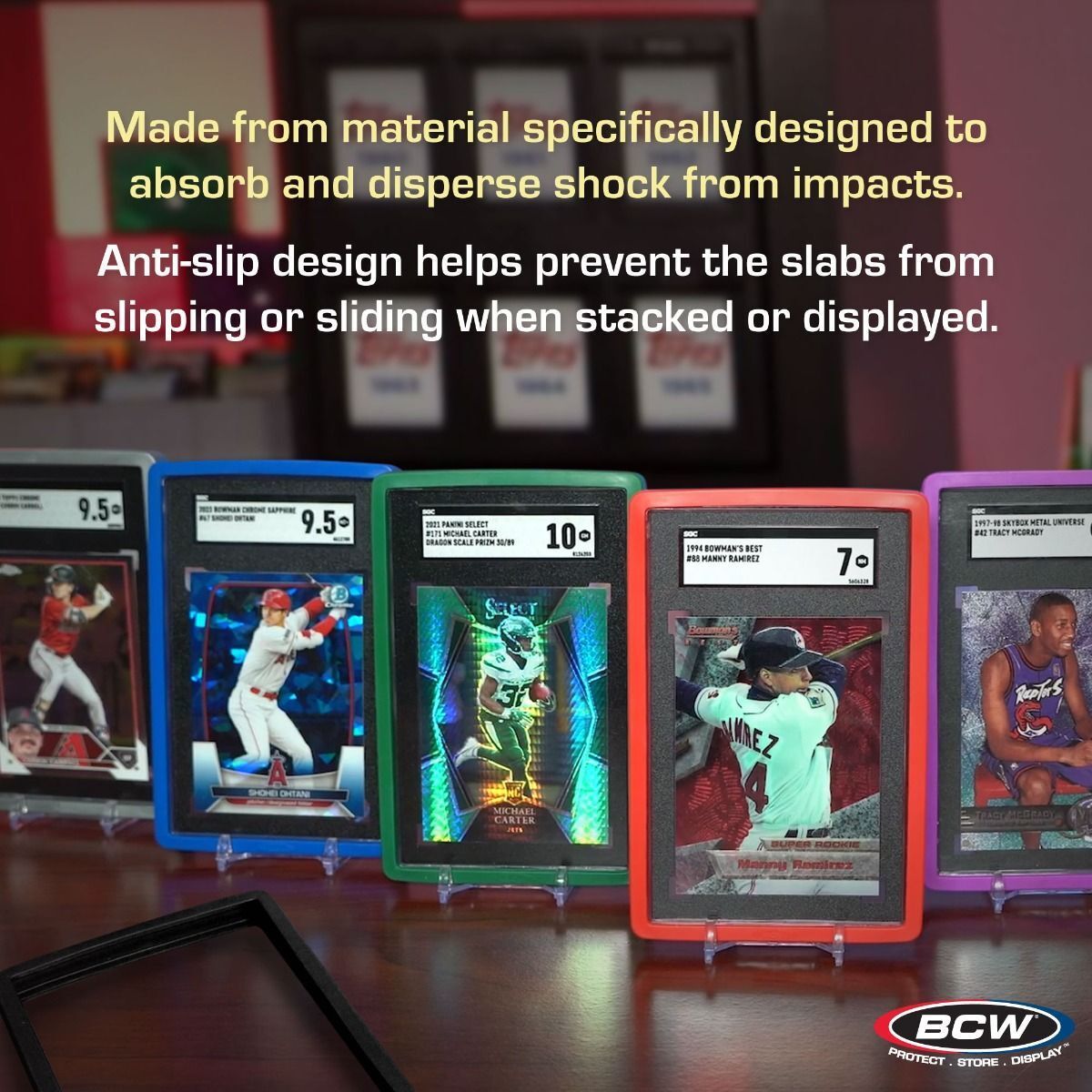 Protect your graded cards from scratches, scuffs, chips, and cracks with BCW Slab Bumpers. These Slab Bumpers are sized to hold the modern, standard-card slabs from Sportscard Guaranty Corporation (SGC). Slab Bumpers are made from durable thermoplastic elastomers (TPE), which has elastic properties similar to silicone. Insert the SGC slab through the back of the bumper, which is the side with the rounded corners (the BCW logo is on the front).