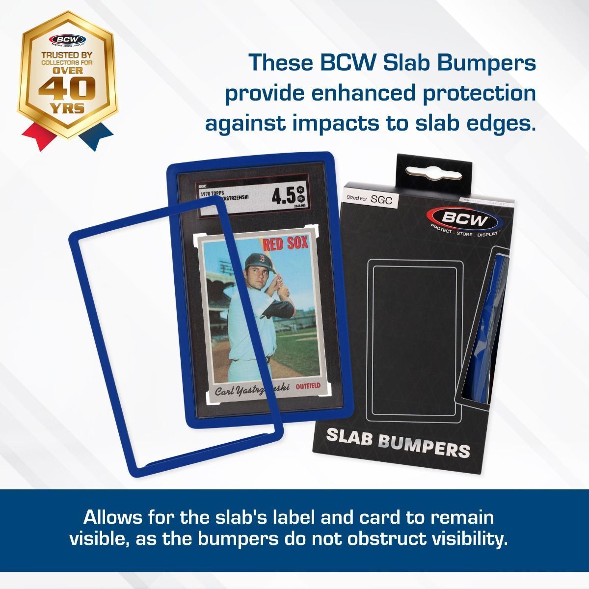 Protect your graded cards from scratches, scuffs, chips, and cracks with BCW Slab Bumpers. These Slab Bumpers are sized to hold the modern, standard-card slabs from Sportscard Guaranty Corporation (SGC). Slab Bumpers are made from durable thermoplastic elastomers (TPE), which has elastic properties similar to silicone. Insert the SGC slab through the back of the bumper, which is the side with the rounded corners (the BCW logo is on the front).