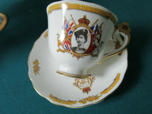 2- ELIZABETH CROWNED QUEEN SOUVENIR CUP AND SAUCER BY RADNORS ENGLAND [*96B-RACK5]