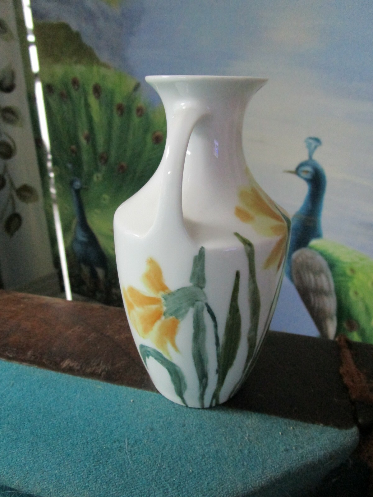 1- REINHOLD SCHLEGELMILCH RS Germany vase with fine flower decoration and two handles, 5 1/2" tall by 2 1/2" from handle to handle [70J]