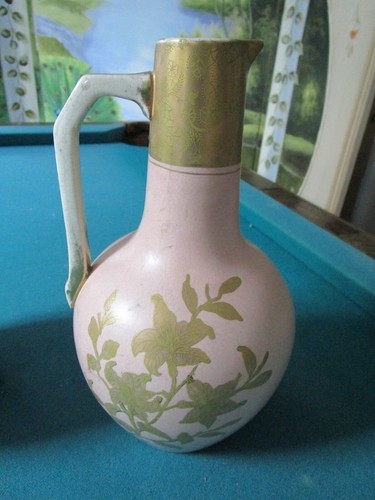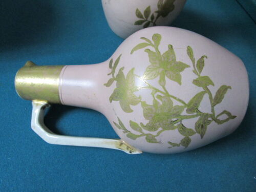 THOMAS FORESTER SONS, Staffordshire c1920s two vases/jars golden handles, pink body with golden leaves, 10 1/2" tall [OUTBACKRACK2POT-I]