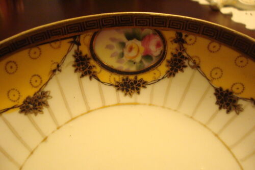 Noritake c1920s, one handle candy dish 6 1/2" very good condition, some light surface scratches commensurate with age. some light gold and color fading commensurate with age