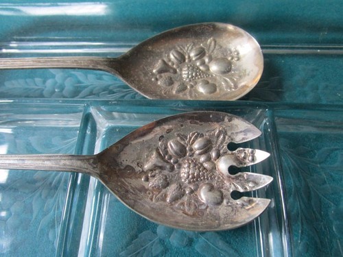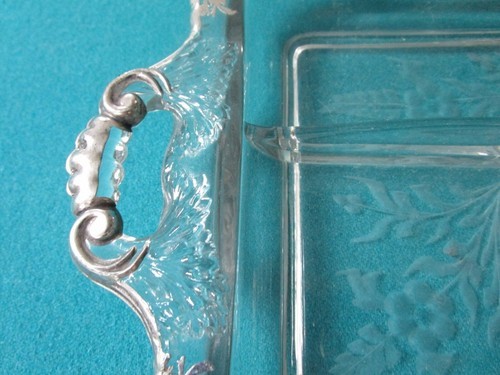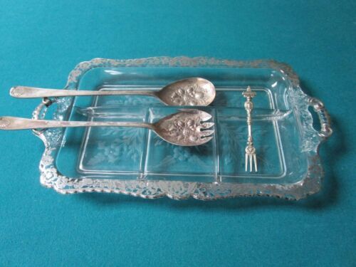 SILVER OVERLAY GLASS TRAY WITH ONLY ONE , THE DENTED SPOON. THE SMALL PIN IS THERE [100G], SERVERS ARE SHEFFIELD, UNMARKED PICK, VERY GOOD CONDITION?