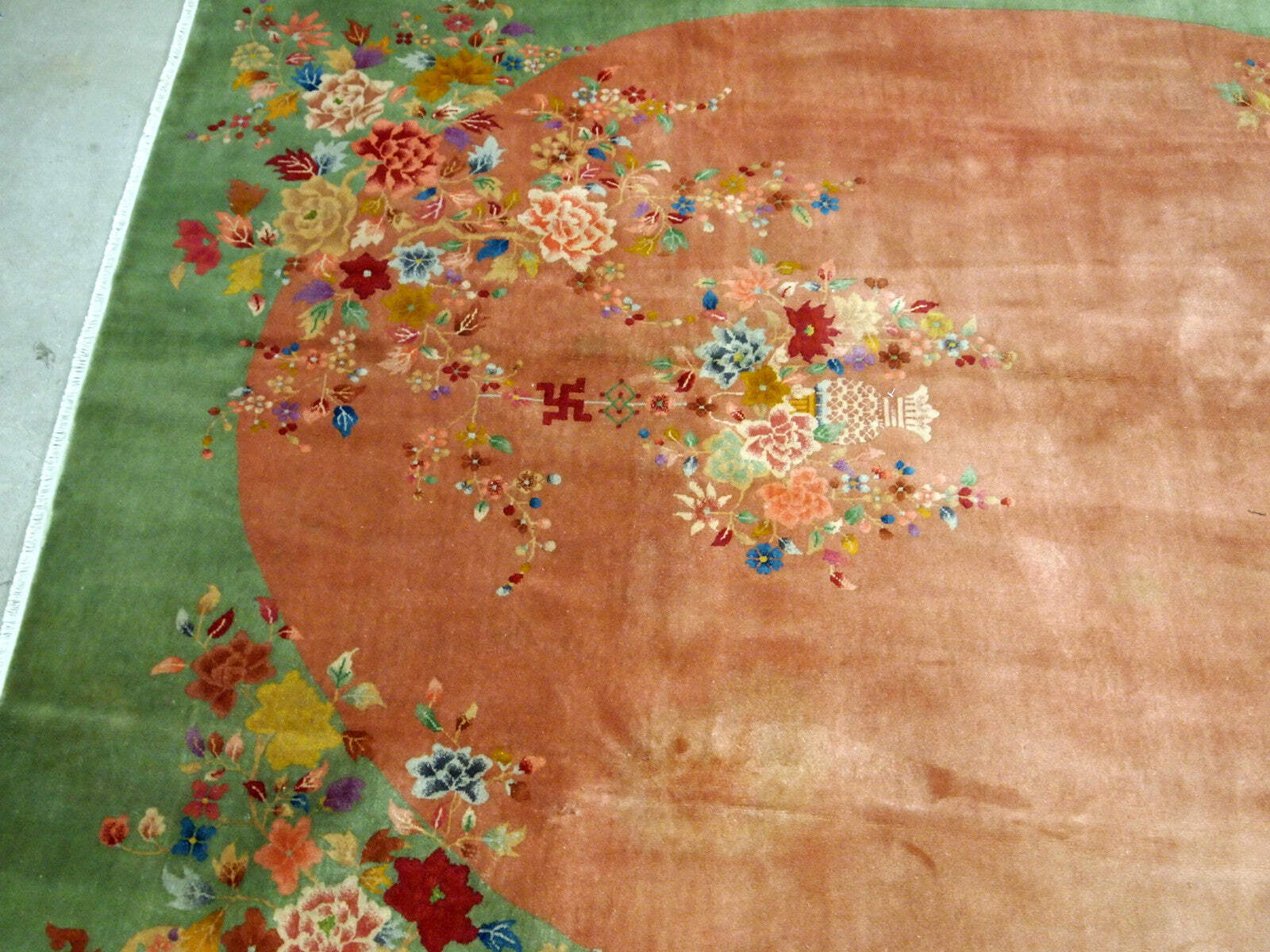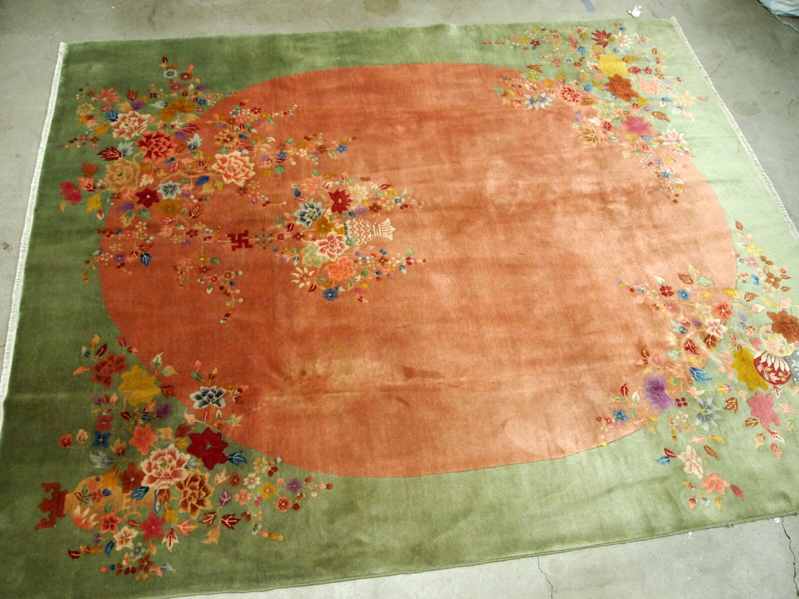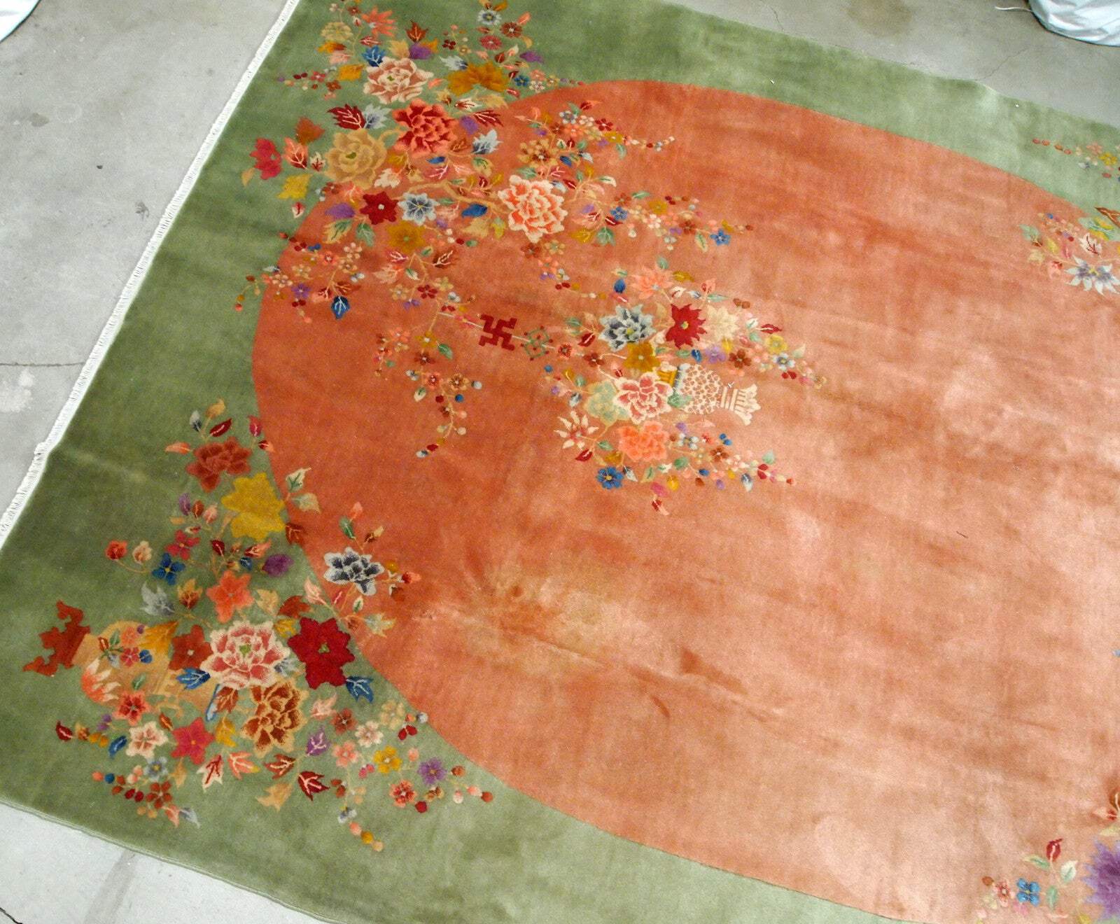 Handmade antique Art Deco Chinese rug in orange and green colors. The rug is from the end of 20th century in original good condition. The rug has a symbol of Indian swastikas'.-condition: original good,-circa: 1920s,-size: 9.1' x 11.6' (273cm x 353cm),-material: wool,-country of origin: China,-style: Art Deco,-background colors: orange, green, blue, red, rose, purple.