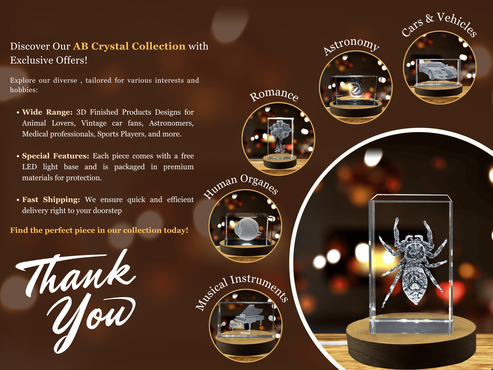 First, our designers create a unique and detailed 3D model. Then, our skilled technicians etch the 3D model into crystal using advanced laser technology.