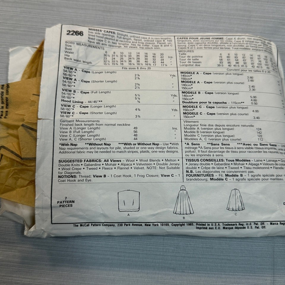 1985 McCall's Vintage Sewing Pattern 2266 - Capes