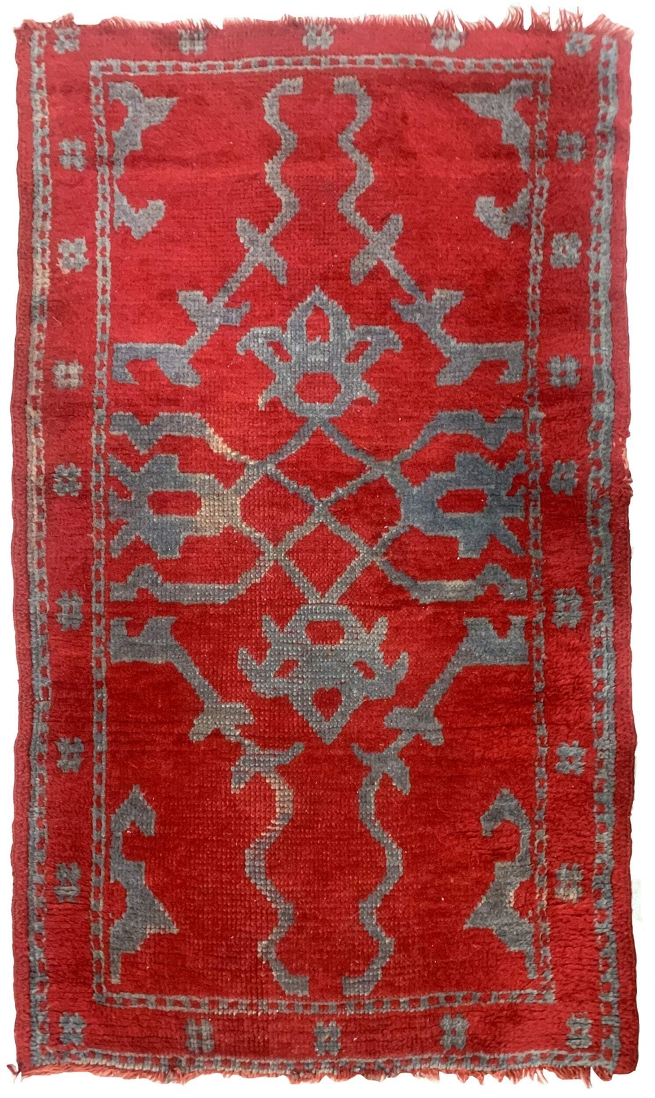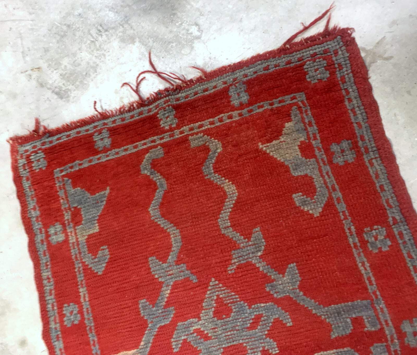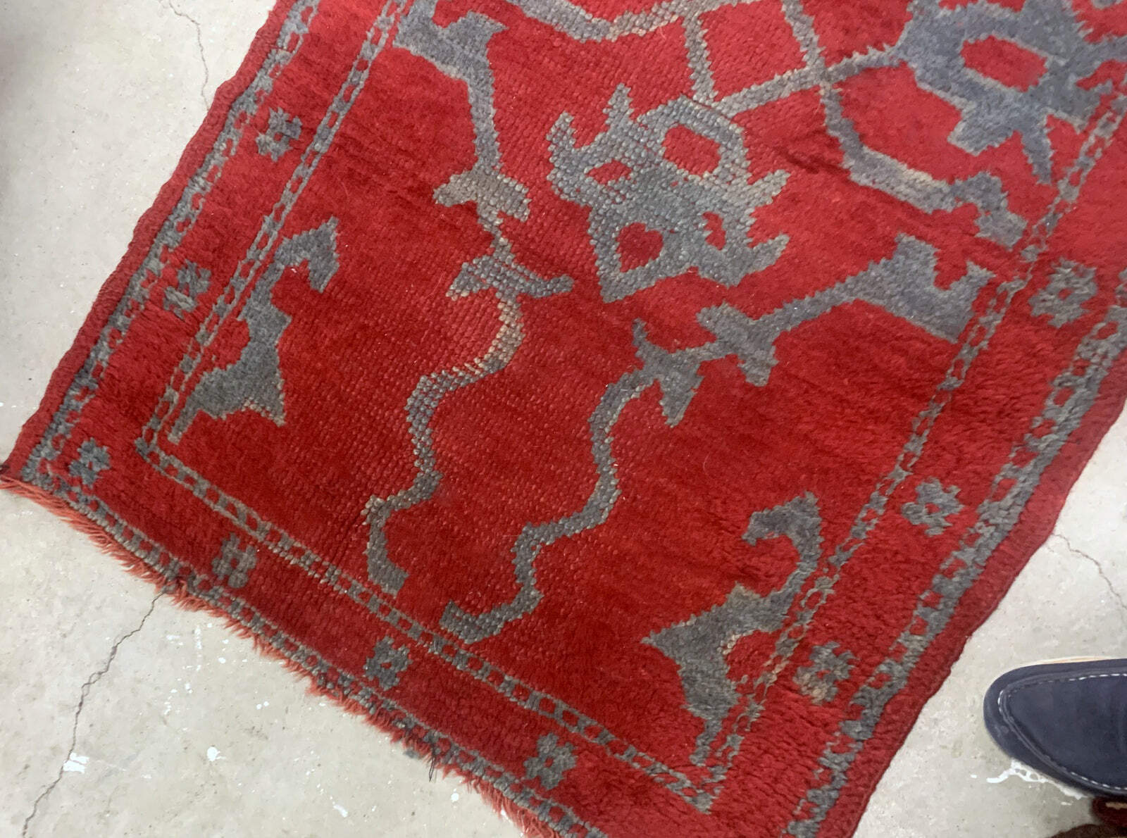 Handmade antique Turkish red rug from Oushak region. The rug is from the end of 19th century in original condition, it has some signs of age. -condition: original, some signs of age,-circa: 1880s,-size: 3' x 4.9' (91cm x 149cm),-material: wool,-country of origin: Turkey,-style: Oushak,-background colors: red, grey.