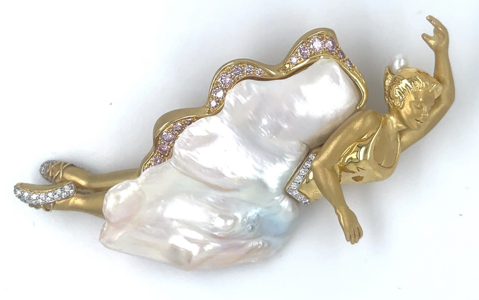 Avi A Z 18k Yellow Gold Cultured Pearl Ballerina Brooch w/ Pink White Diamond