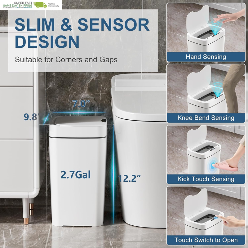 ?SPACE SAVING EASY TO USE? The 2.7 Gal Slim Bathroom Trash Can fits perfectly in narrow spaces. Measuring 7.0" W, 9.8" W, 12.2" H maximizes indoor space utilization. It's suitable for use in bathrooms, kitchens, bedrooms, living rooms, offices, dorms, and more.