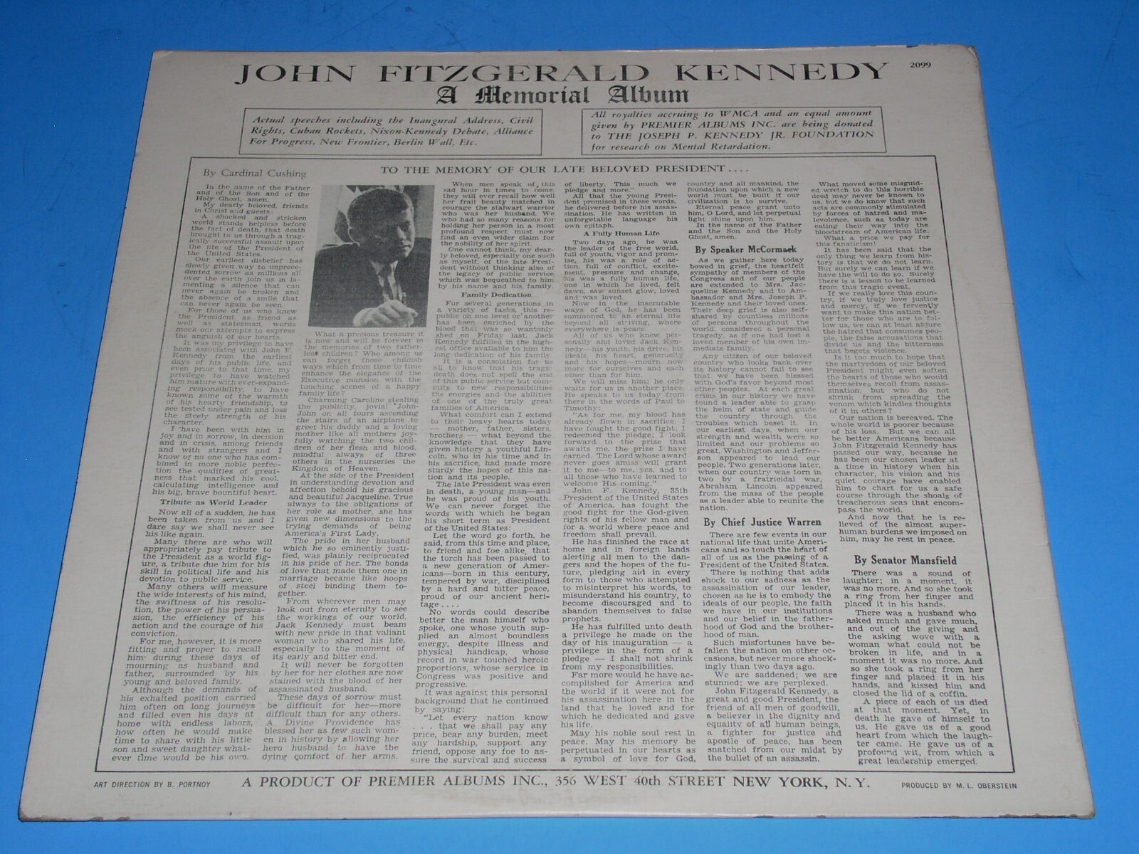 This is a vintage phonograph record album, entitled, "John Fitzgerald Kennedy A Memorial Album". Record label: Premier 2099.