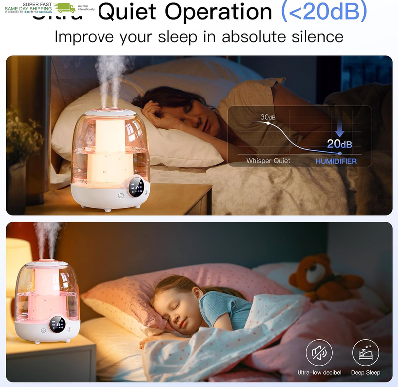 Ultra-Quiet Operation Below 20dB ? Enjoy a peaceful, quiet humidification experience with this humidifier, operating at less than 20dB. Ideal for bedrooms, nurseries, and other quiet spaces, ensuring a restful night's sleep. A perfect choice for humidifiers for bedroom and humidifiers for bedroom baby