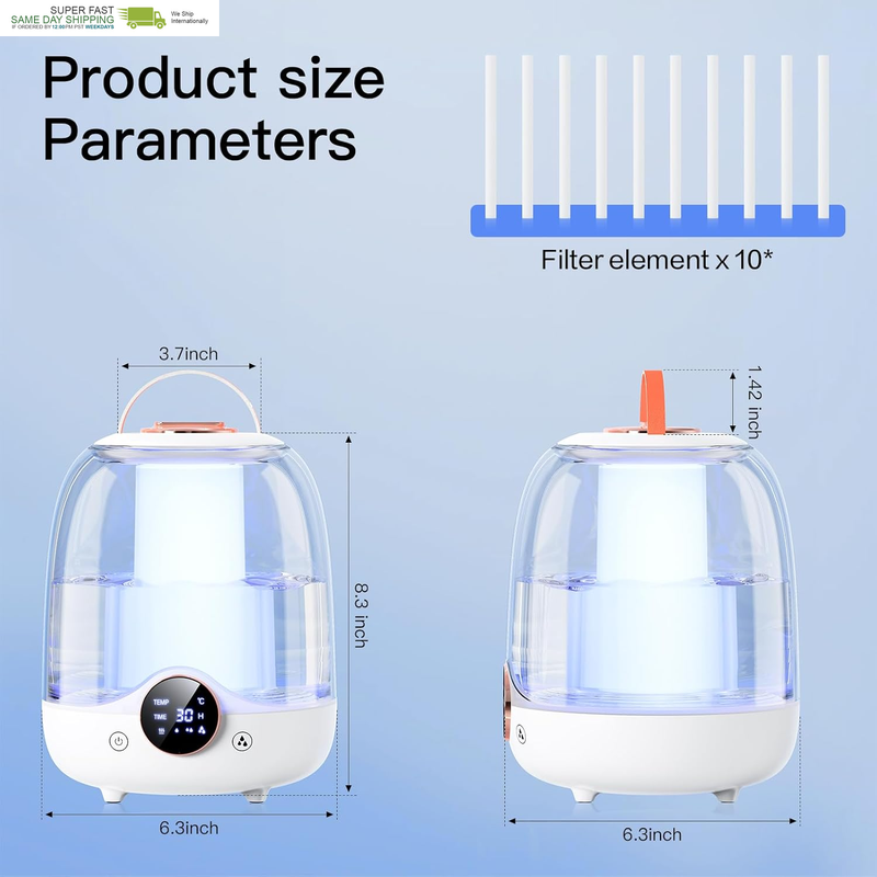 Smart Digital Display with Water Temperature Timer ? The smart digital display shows the water temperature in real-time, helping you monitor the humidifier?s performance. The timer function allows you to set it for 2, 4, or 8 hours, offering flexibility and convenience. Additionally, it has an auto shut-off feature for safety when the water level is low. Comes with 10 filter cartridges for extended use