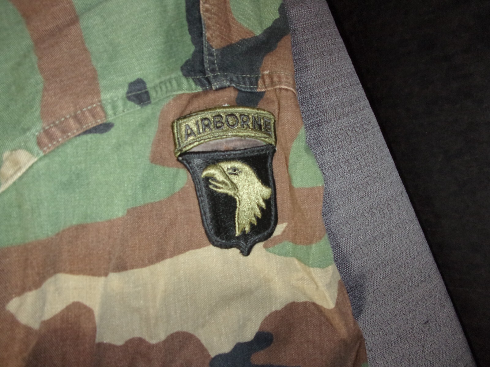 USGI ARMY BDU WOODLAND CAMOUFLAGE CUSGI ARMY BDU WOODLAND CAMOUFLAGE COMBAT JACKET 10ST AIRBORNE PATCH MEDIUM SHORTOMBAT JACKET AIRBORNE PATCH MEDIUM SHORT