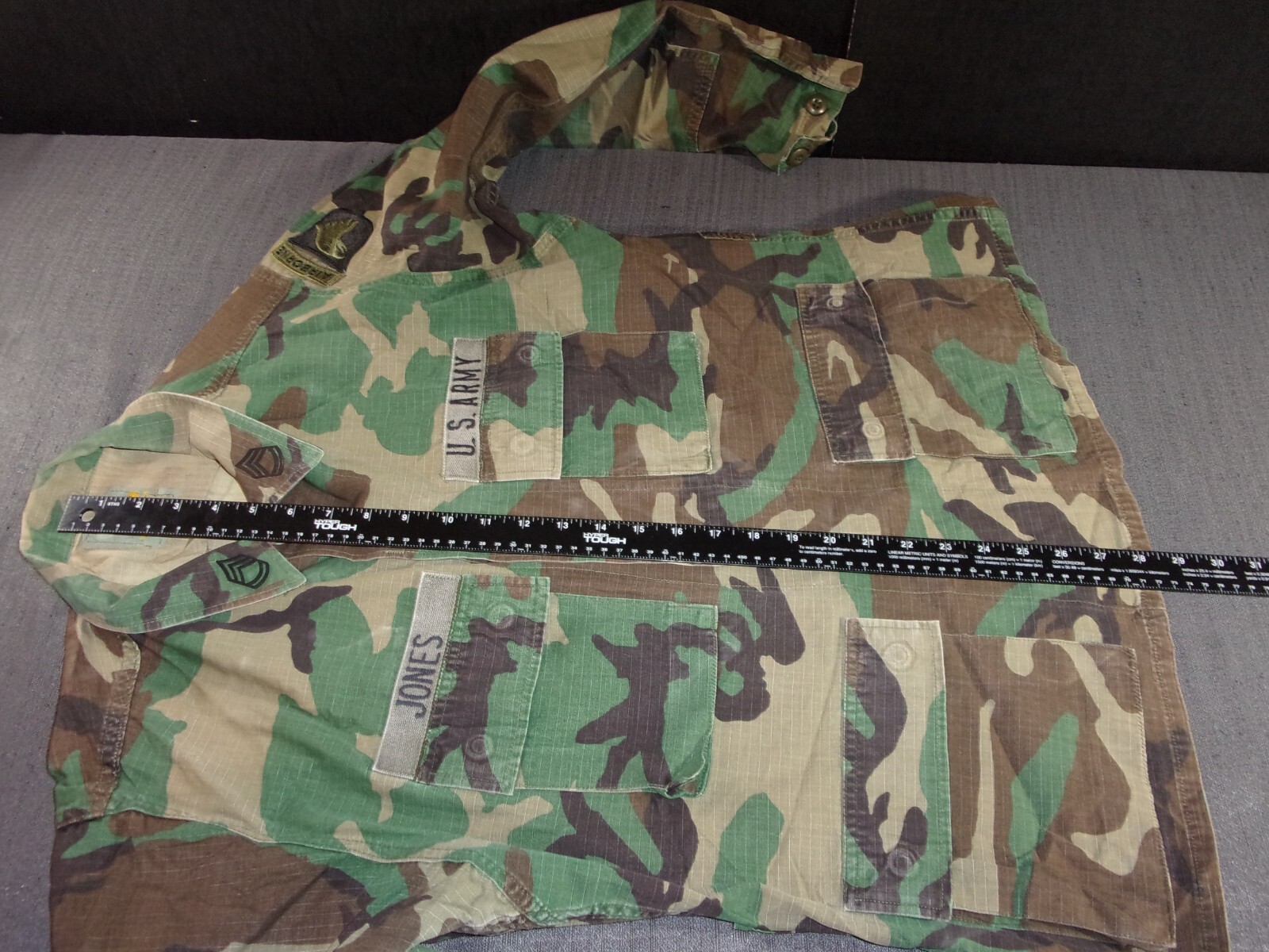 BDU WOODLAND COMBAT TACTICAL JACKET WITH ORIGINAL PATCHES AND ORIGINAL RANK
