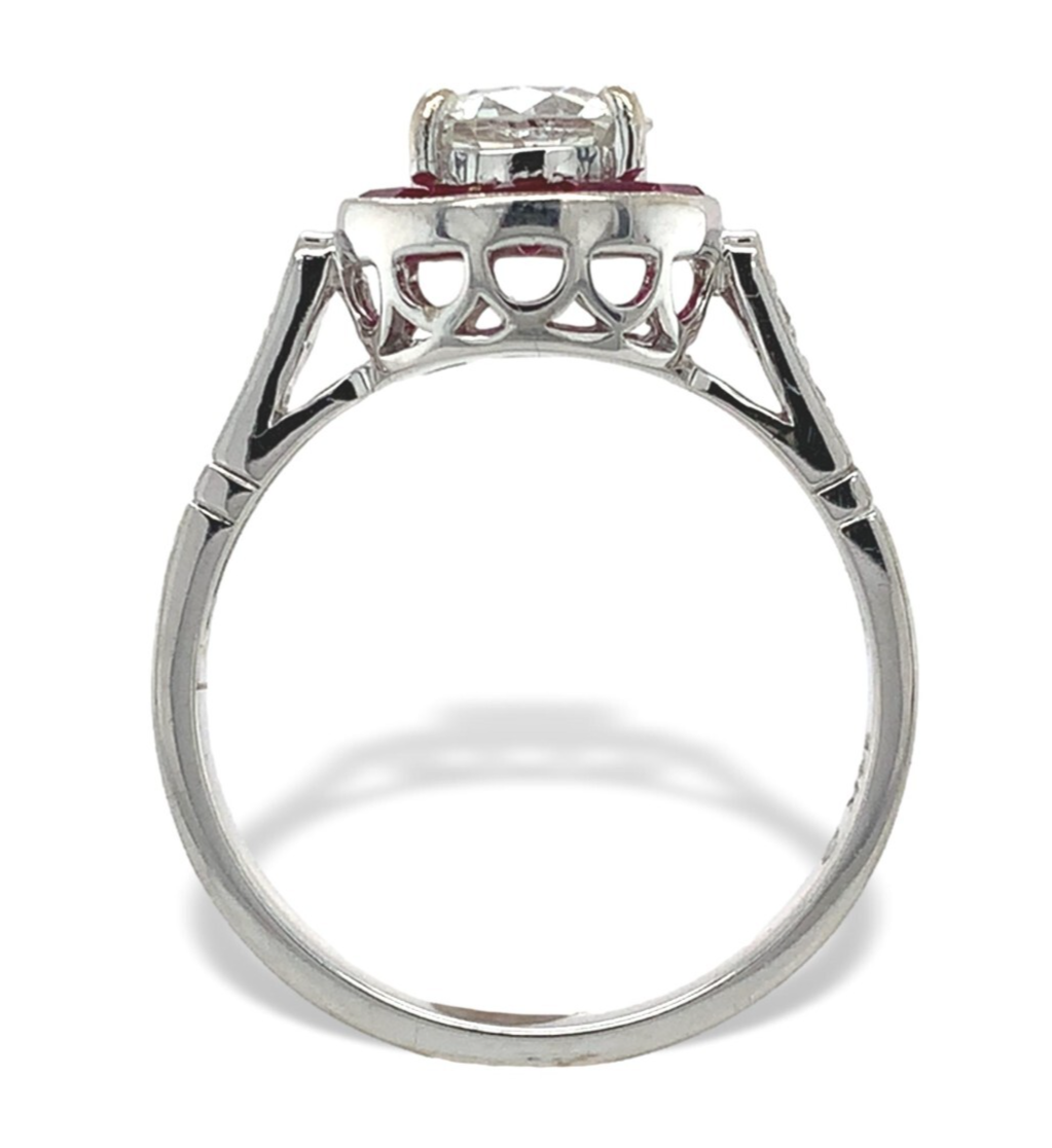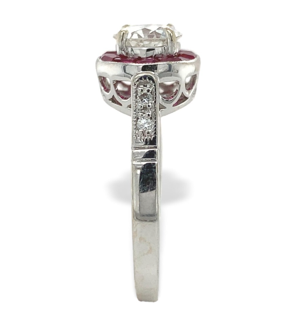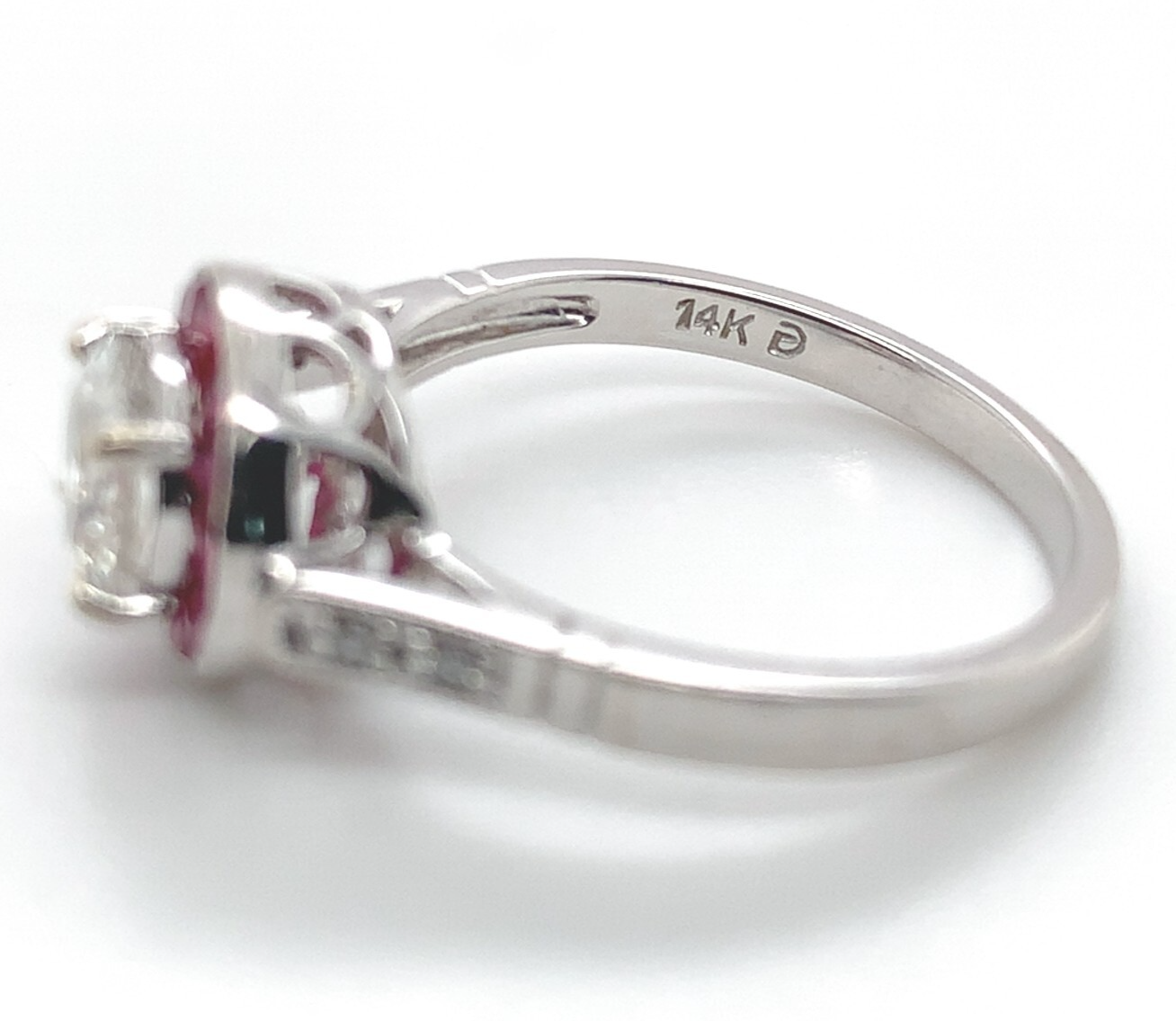 14k white gold ring made in Art Deco style featuring diamonds and rubies. In the center is a European cut diamond weighing about .80cts and measuring 6.1mm x 6.2mm x 3.5mm. The diamond has H-I color and SI2-I1 clarity. The diamond has a chip.