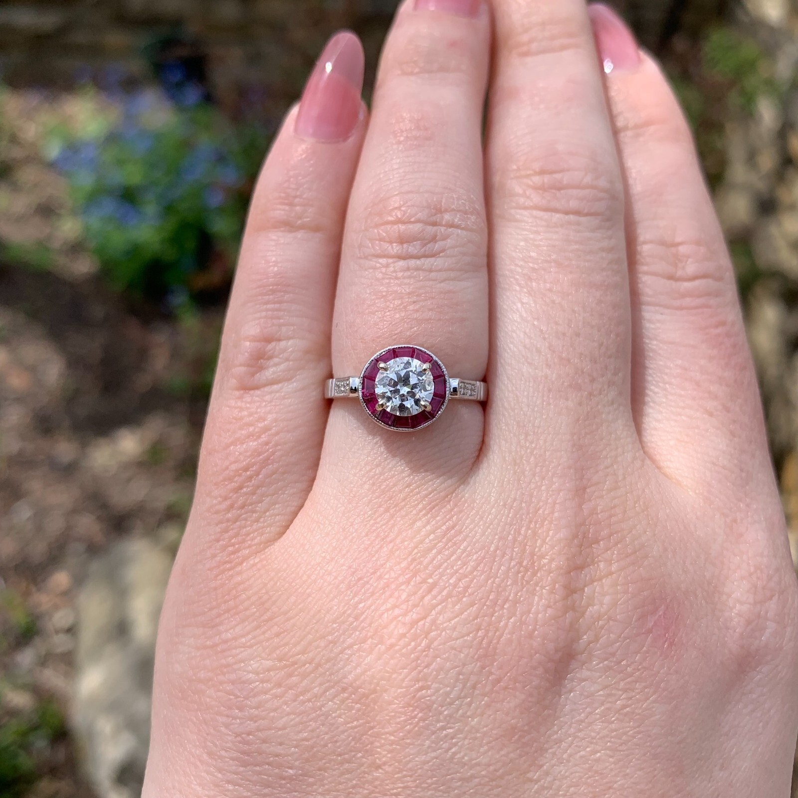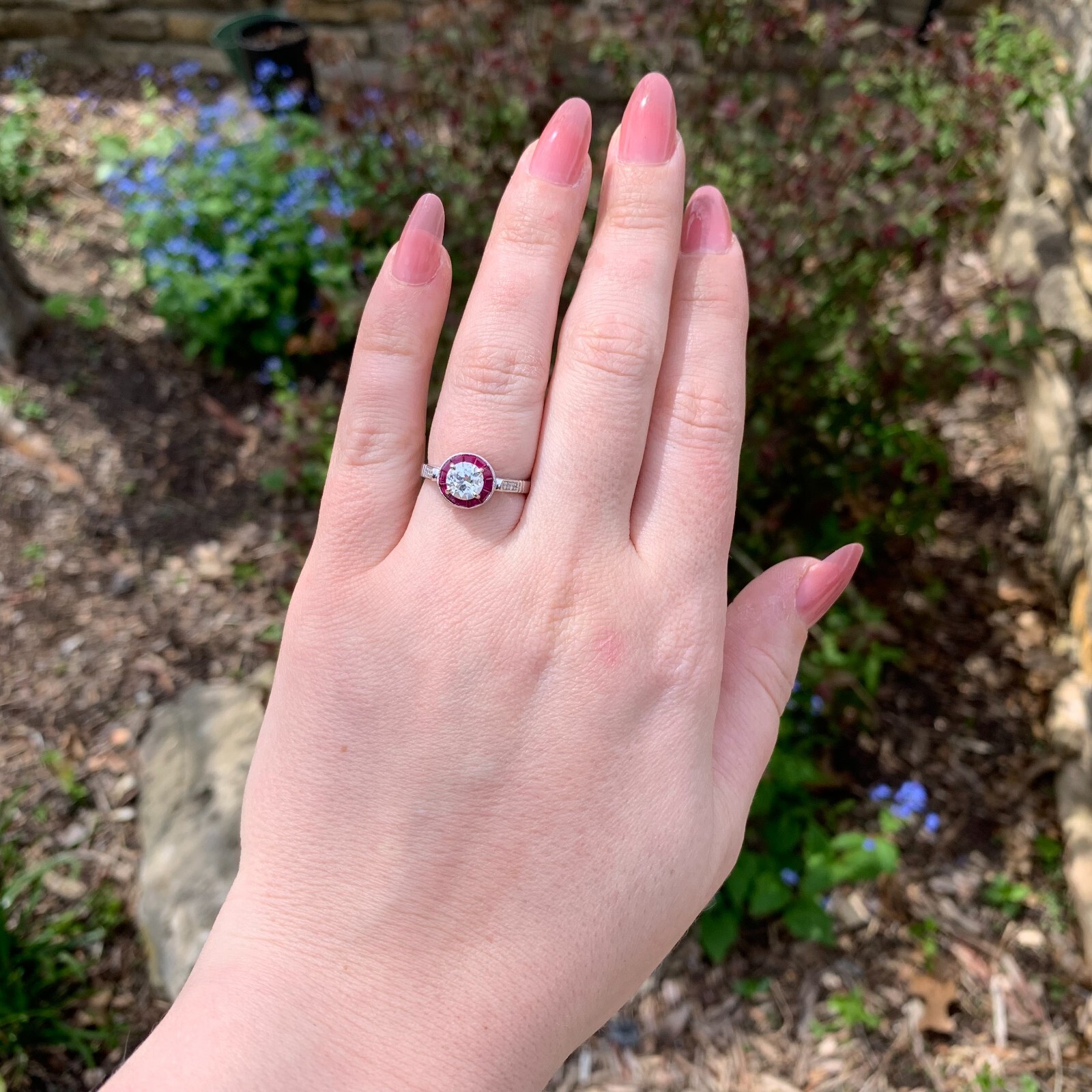 There is a halo of calibre specialty cut genuine rubies weighing about 1/2ct total. There are twelve rubies with true red color. There are four tiny round diamond accents measuring about 1mm and weighing .03cts total.
