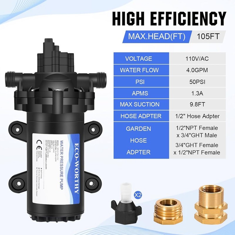 Diaphragm Pump: 110V AC water diaphragm pump provides 4.0GPM flow capacity. Turns on and off using water pressure at 50PSI, 1.3 Max amps. AC power supply, no need to carry marine battery with you