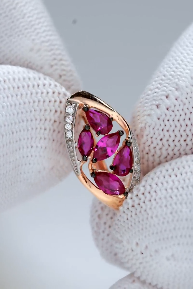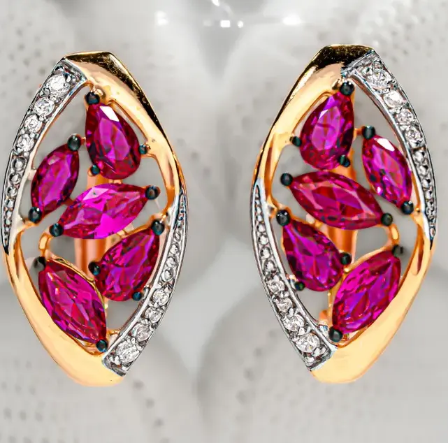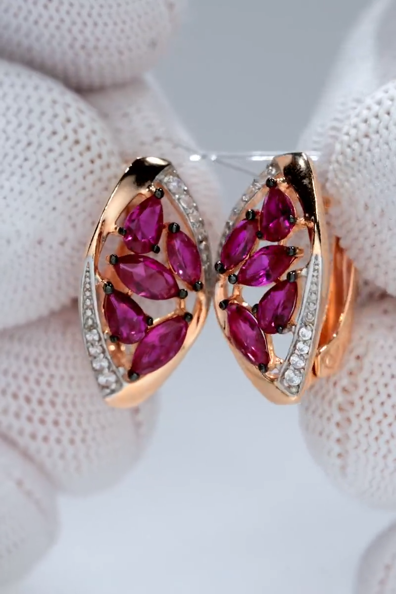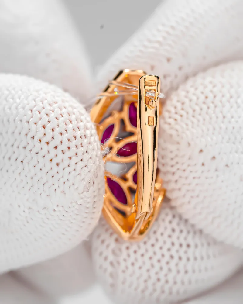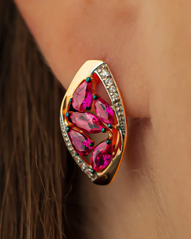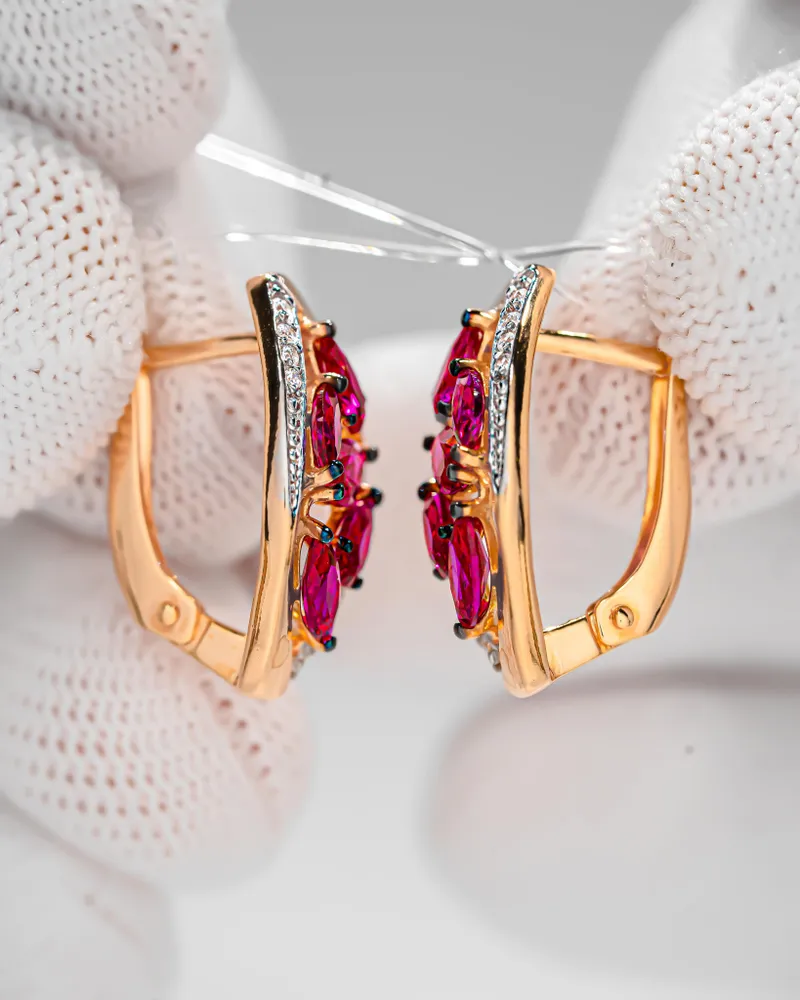 Parameters of Earrings: Height 20 mm, width 11 mm: pin length 10 mm (classic). Each product has a 925 sample, a nameplate, a seal and a tag with a legal address, as well as information about the stones and metal, each product passes the assay office and a strict check for the precious metal silver. The 585 gold coating is durable, thick, double, initially covered with 999.9 samples, then covered with 585 samples. About the main stone of the jewelry Synthetic corundum often acts as an analogue of sapphire and / or ruby. The price of jewelry with natural sapphires and rubies is quite high, but thanks to the production of synthetic stones, jewelry with luxurious gems has become more affordable and pleases their owners with beauty and radiance. Synthetic stone is a complete analogue of a natural stone, but grown using special technologies in laboratory conditions. Such stones are in no way inferior to natural ones in their properties and appearance. Ruby is a beautiful gemstone, second only to diamond in hardness. Ruby jewelry is considered one of the most expensive in the world, almost all royal and imperial regalia are decorated with these luxurious stones. Similar to frozen drops of blood, ruby ??is considered a warrior's stone, so it suits strong-willed people. ?1912398872
