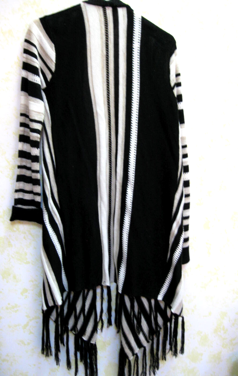 Long Fringed Shawl/Wrap/Cape Black /White/Beige stripe Lg 11-13. Approximately 40" long plus a 6" fringe.