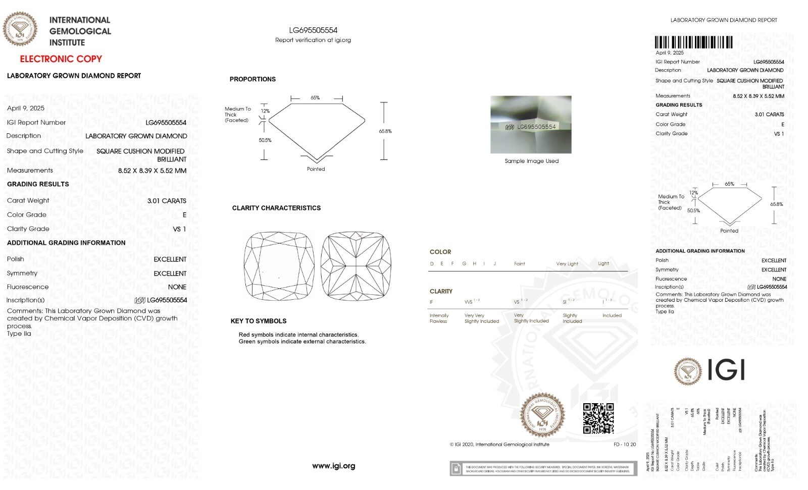 Lab Grown 3.01 Ct CUSHION Cut IGI Certified CVD Diamond E Color VS1 Clarity