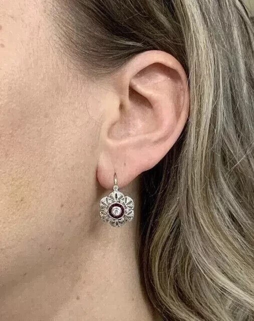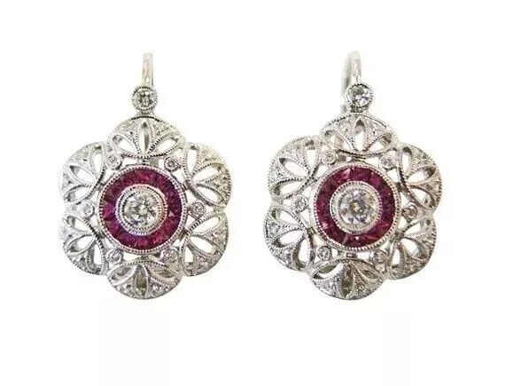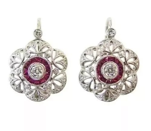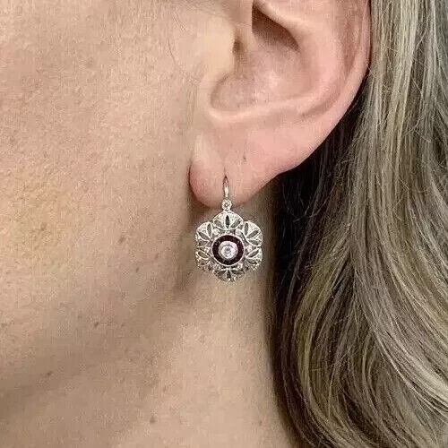 2Ct Vintage Art Deco Lab Created Ruby Drop Dangle Earrings 14K White Gold Plated