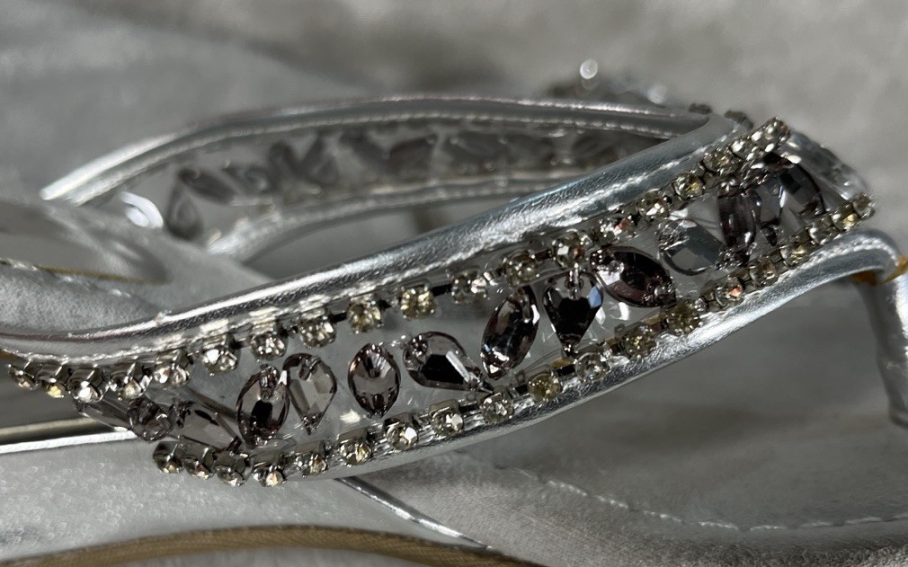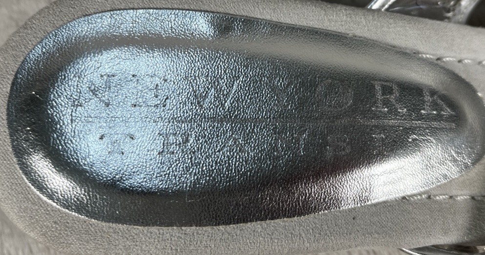 These are stylish women's sandals with a wedge heel, featuring silver rhinestones for added elegance. The New York Transit brand ensures quality and design, perfect for a night out or special occasion. The size 8.5M fits comfortably and the slingback style offers a touch of sophistication. The metallic theme adds a trendy edge to the overall look, making these sandals a standout choice for any fashion-forward woman.