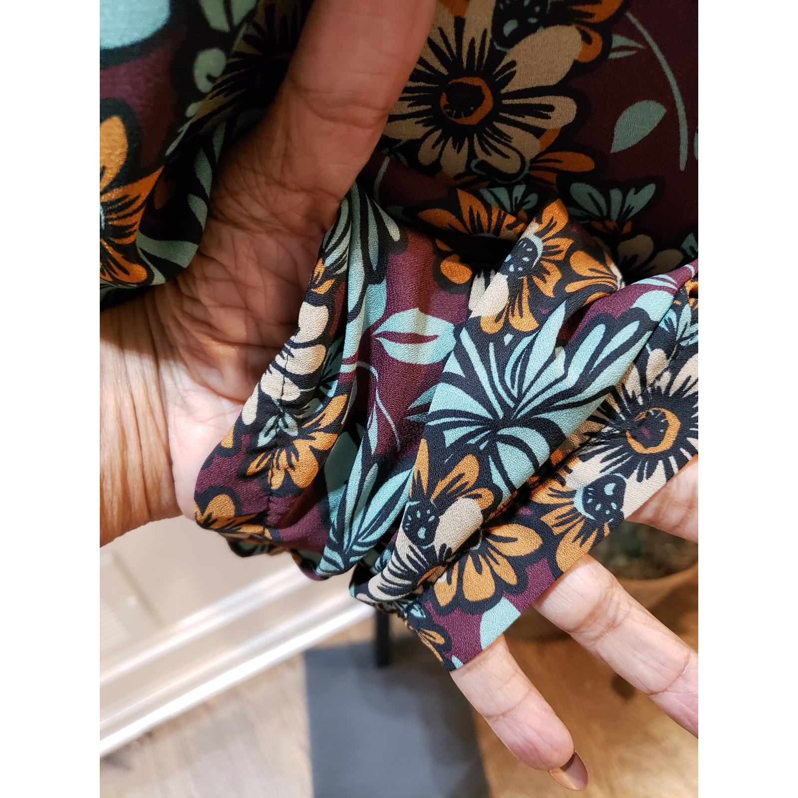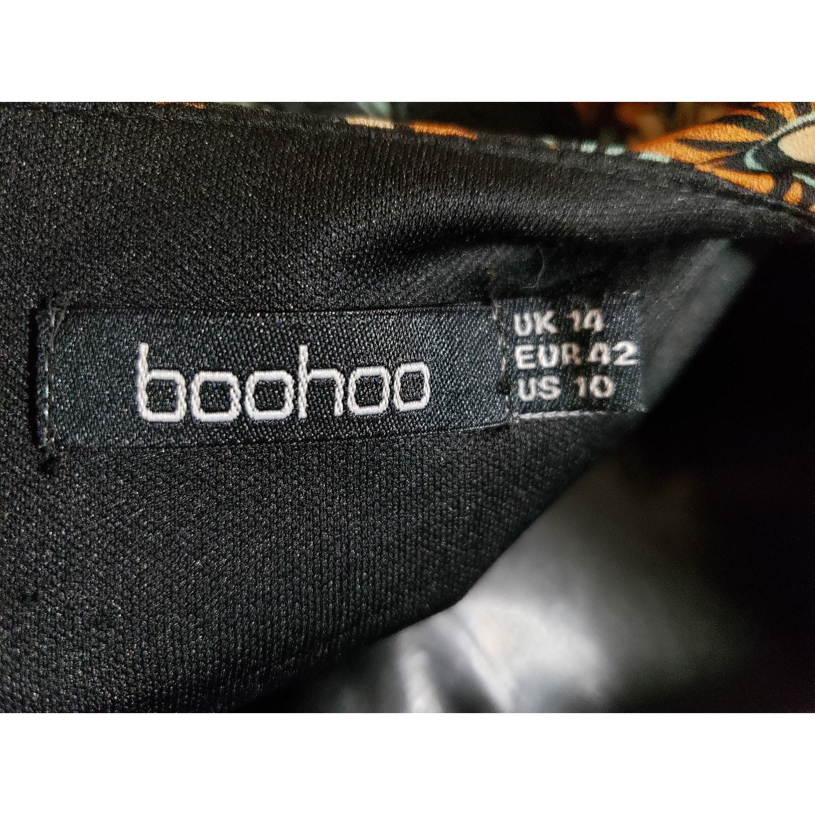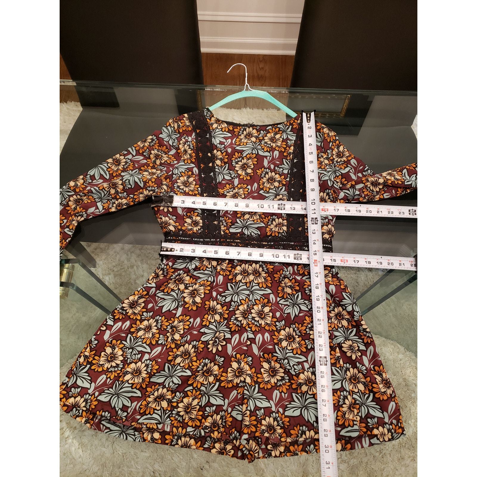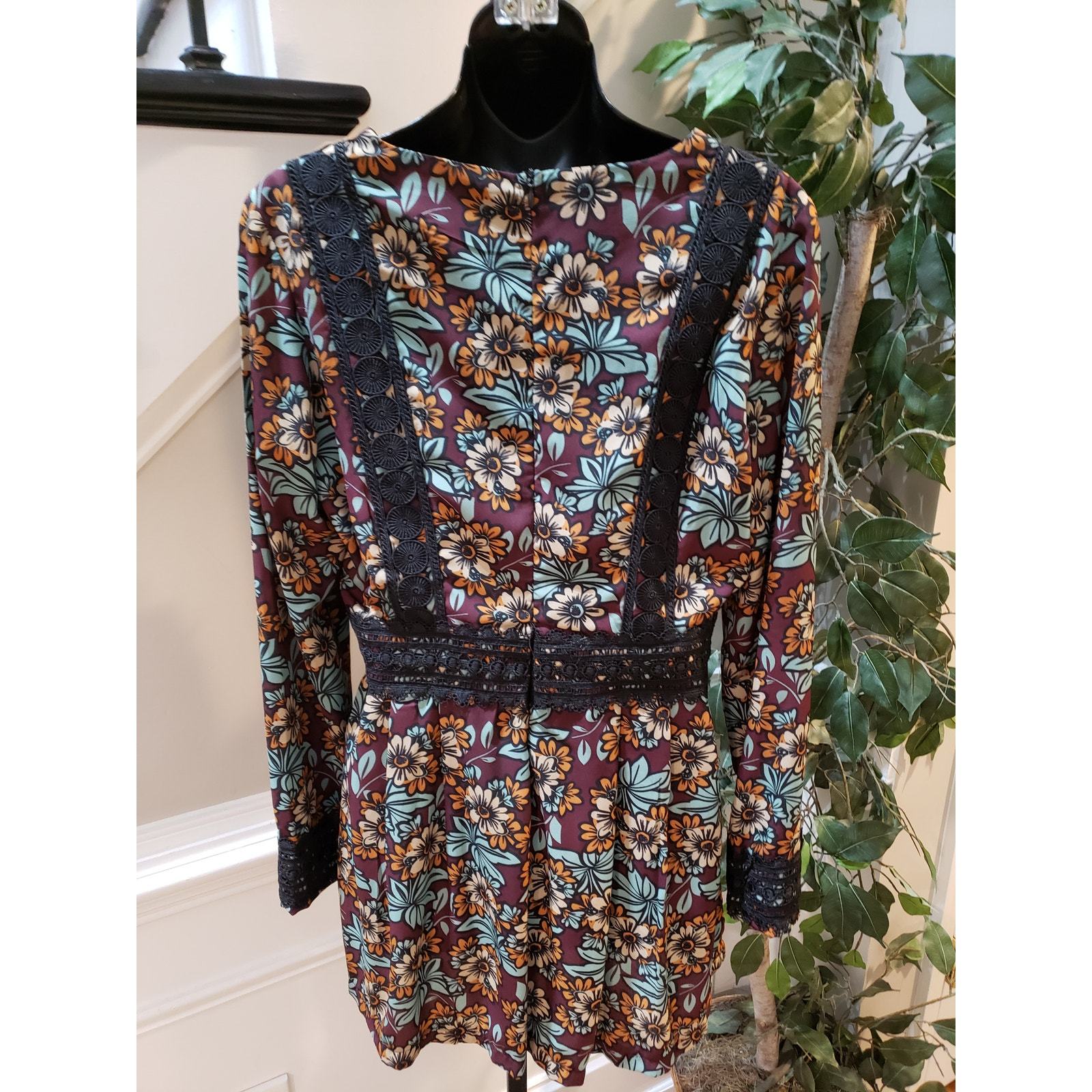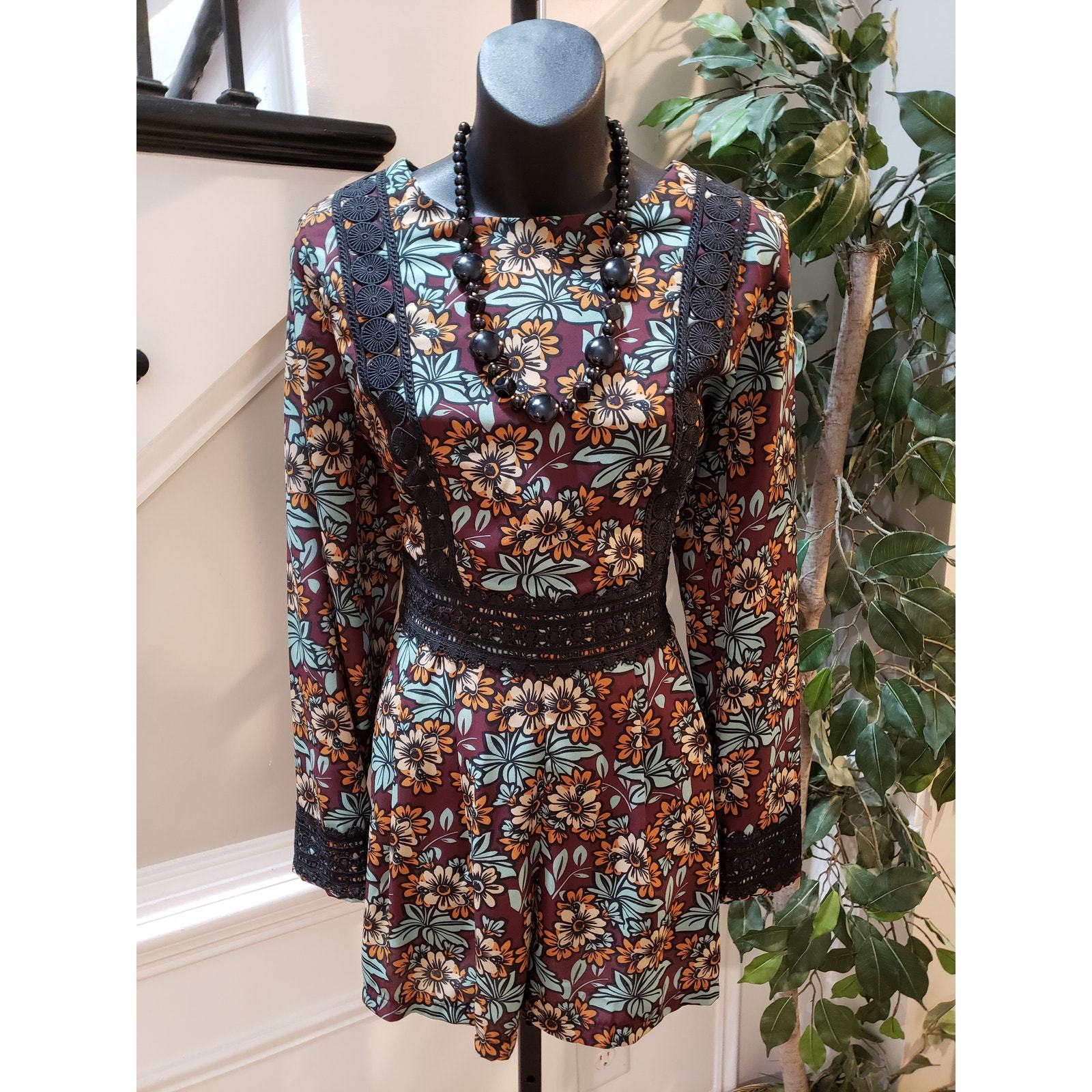 Boohoo women?s long sleeve romper, size US 10 / UK 14 / EU 42, designed to turn heads. Featuring a rich multicolor floral print on a deep burgundy base, this stylish one-piece blends retro charm with modern flair. Accented with elegant black crochet lace trim across the bodice, sleeves, and waist, it offers both shape and sophistication.