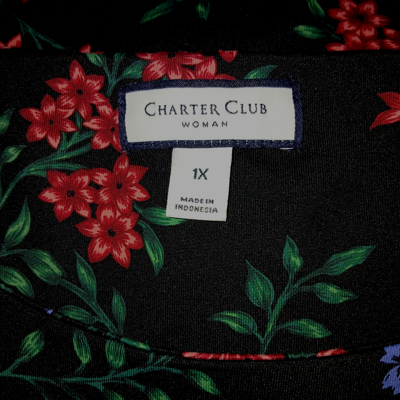 THIS IS A VERY NICE LADIES CHARTER CLUB STRETCH PULLOVER BLACK/FLORAL NYLON/SPANDEX KNIT TOP IN A SIZE 1X. IT IS IN EXCELLENT, LIKE-NEW, CONDITION--WORN ONCE.