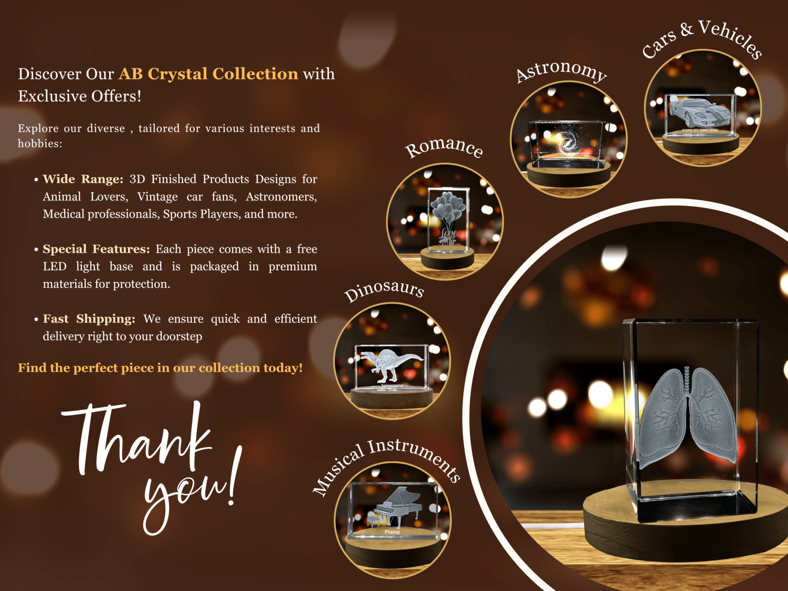 First, our designers create a unique and detailed 3D model. Then, our skilled technicians etch the 3D model into crystal using advanced laser technology.