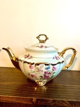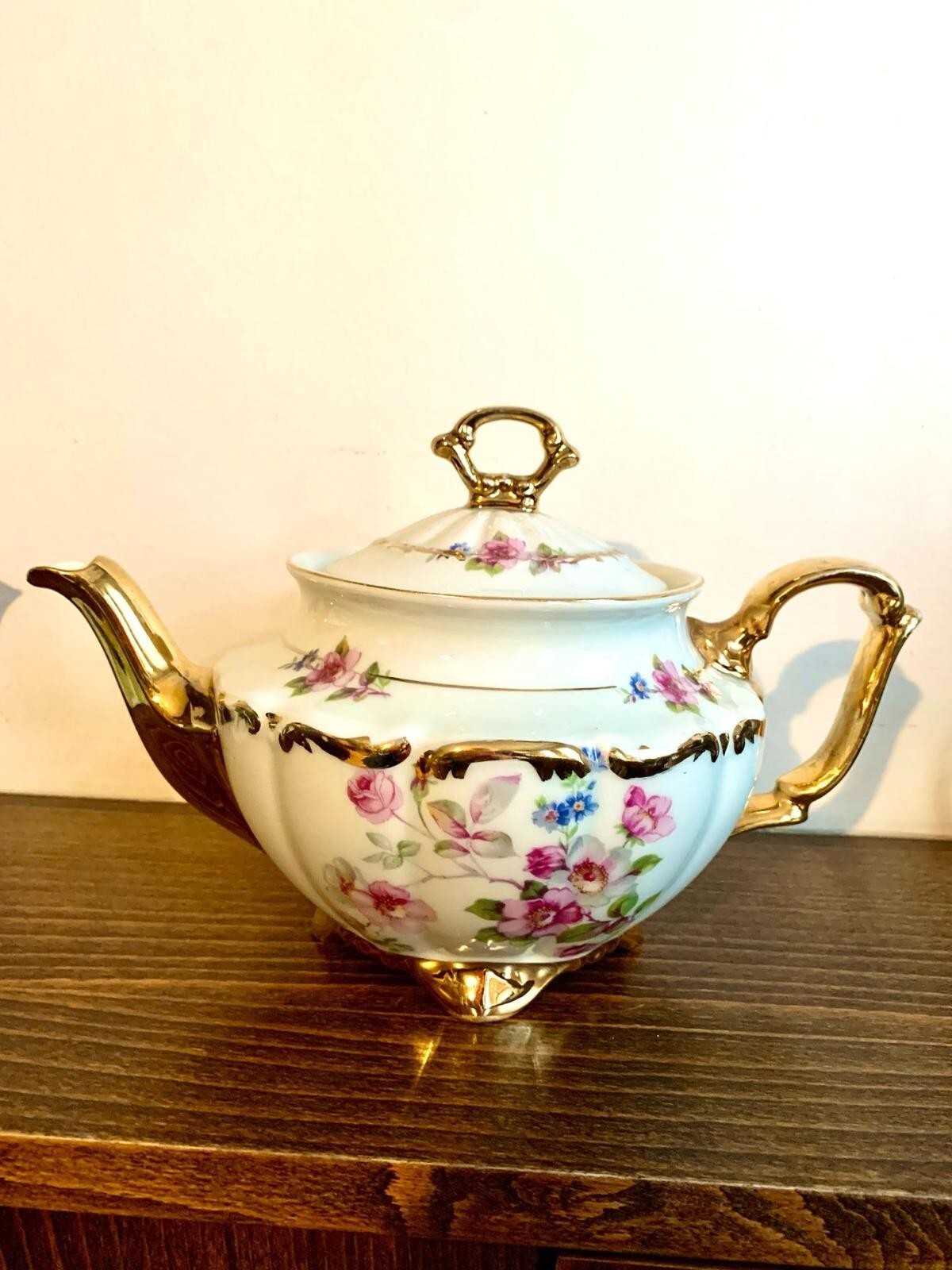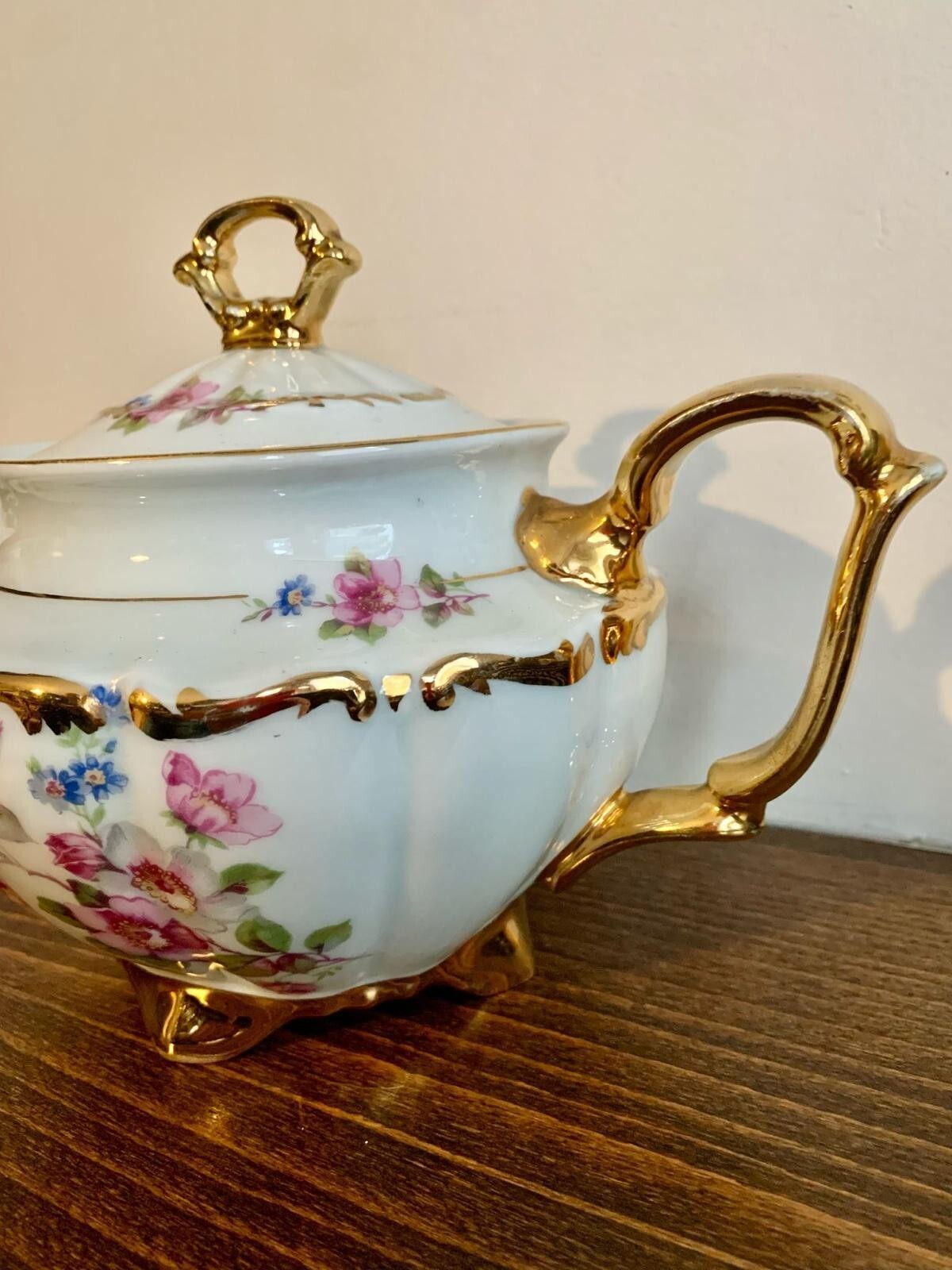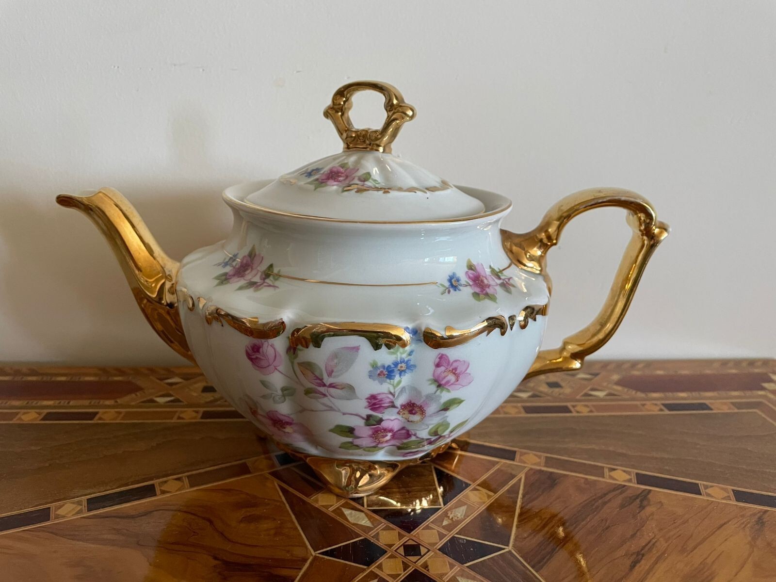 A Handpainted Polish Large Vintage White and Gold Teapot by Carl Tielsch Walbrz
