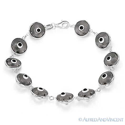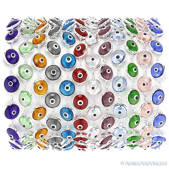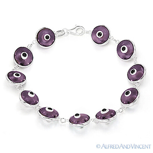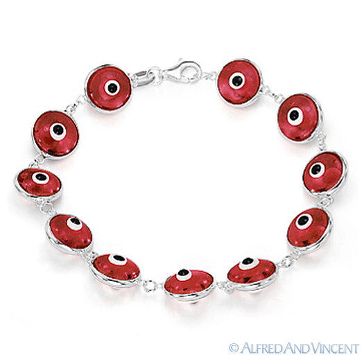 The featured .925 sterling silver bracelets showcase translucent evil eye glass bead charms held by linked bezels. The bracelets are then each finished with a lobster-claw clasp for secure wear.