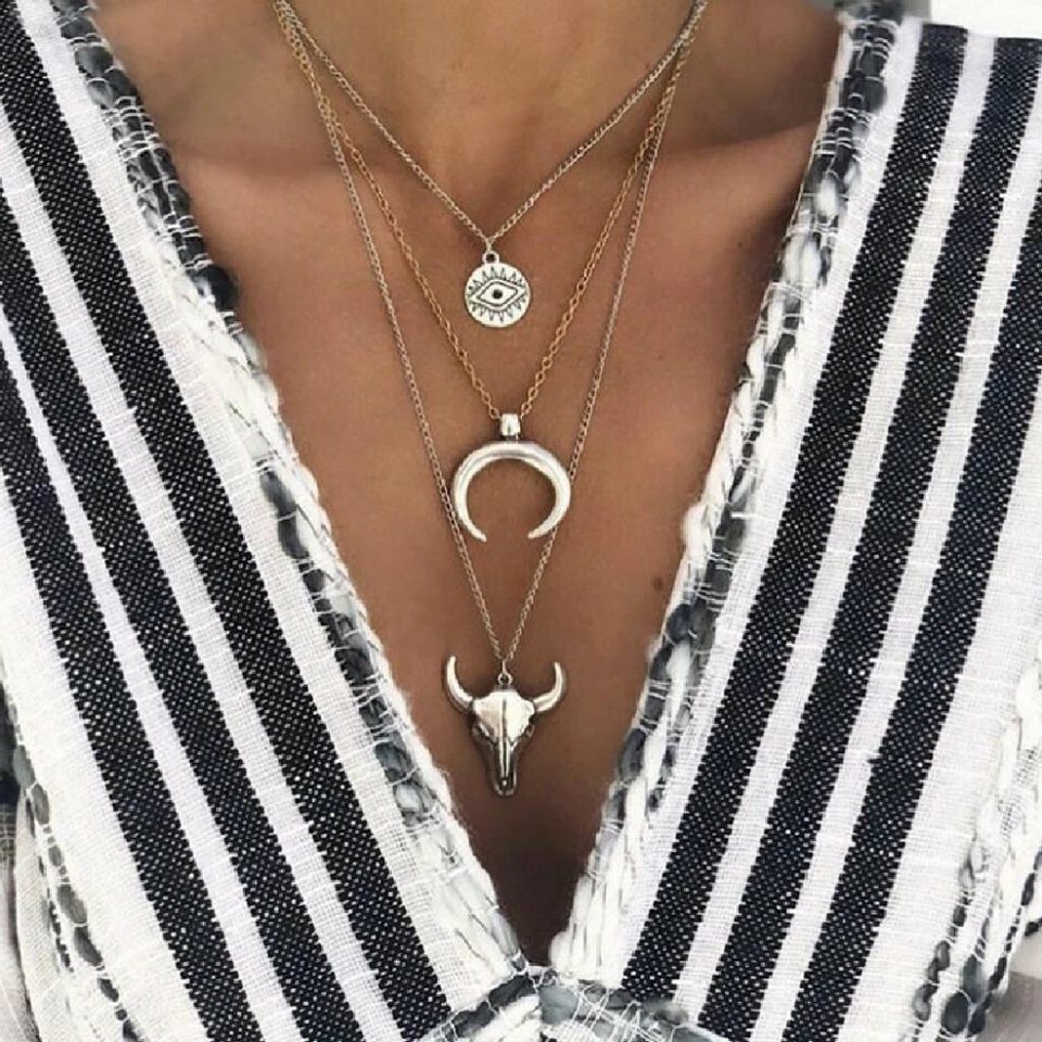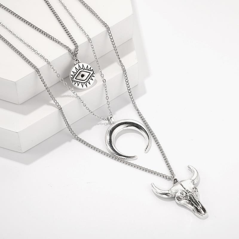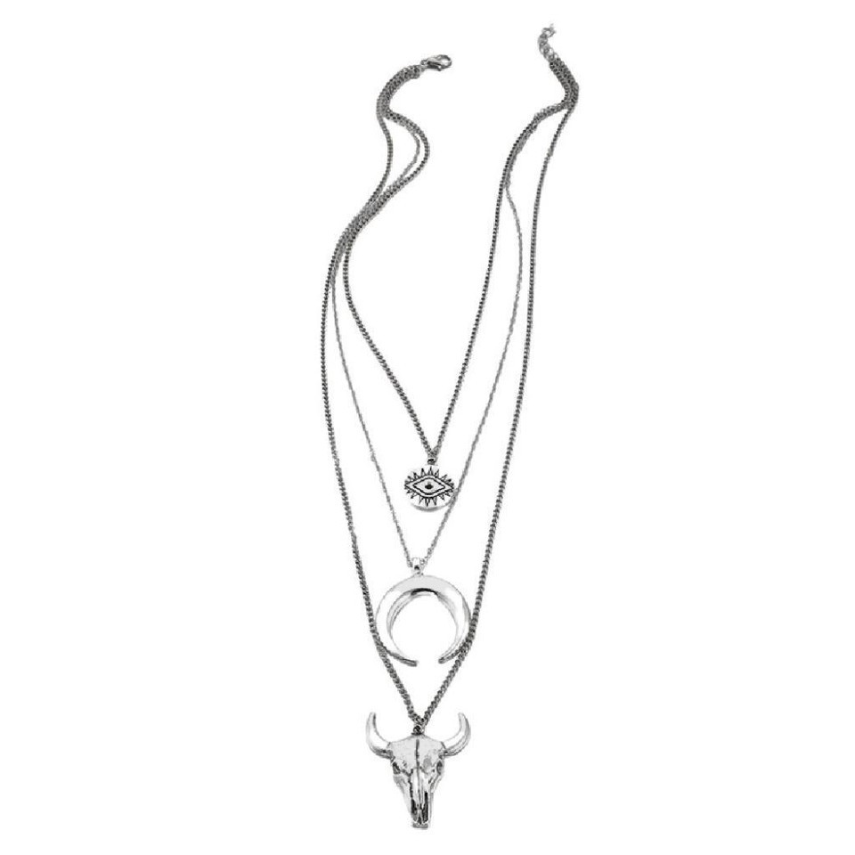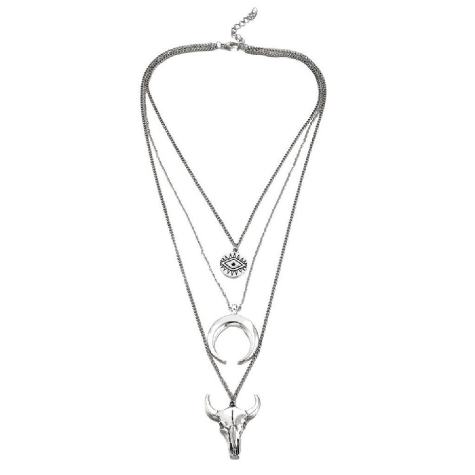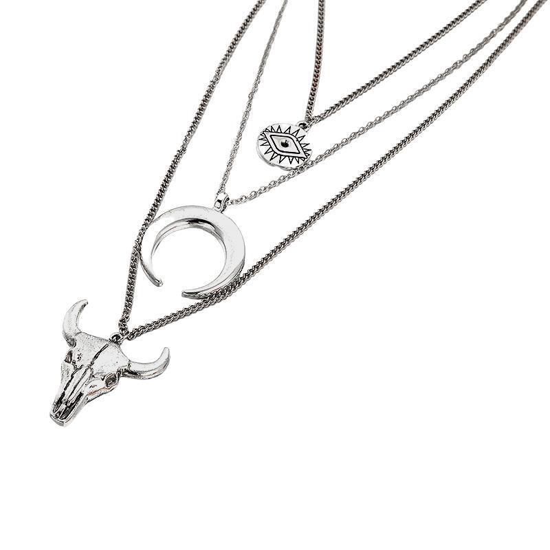 COW SKULL CRESCENT EVIL EYE NECKLACE 15" Chain 3 Layer Tiered Strand Horn NEW