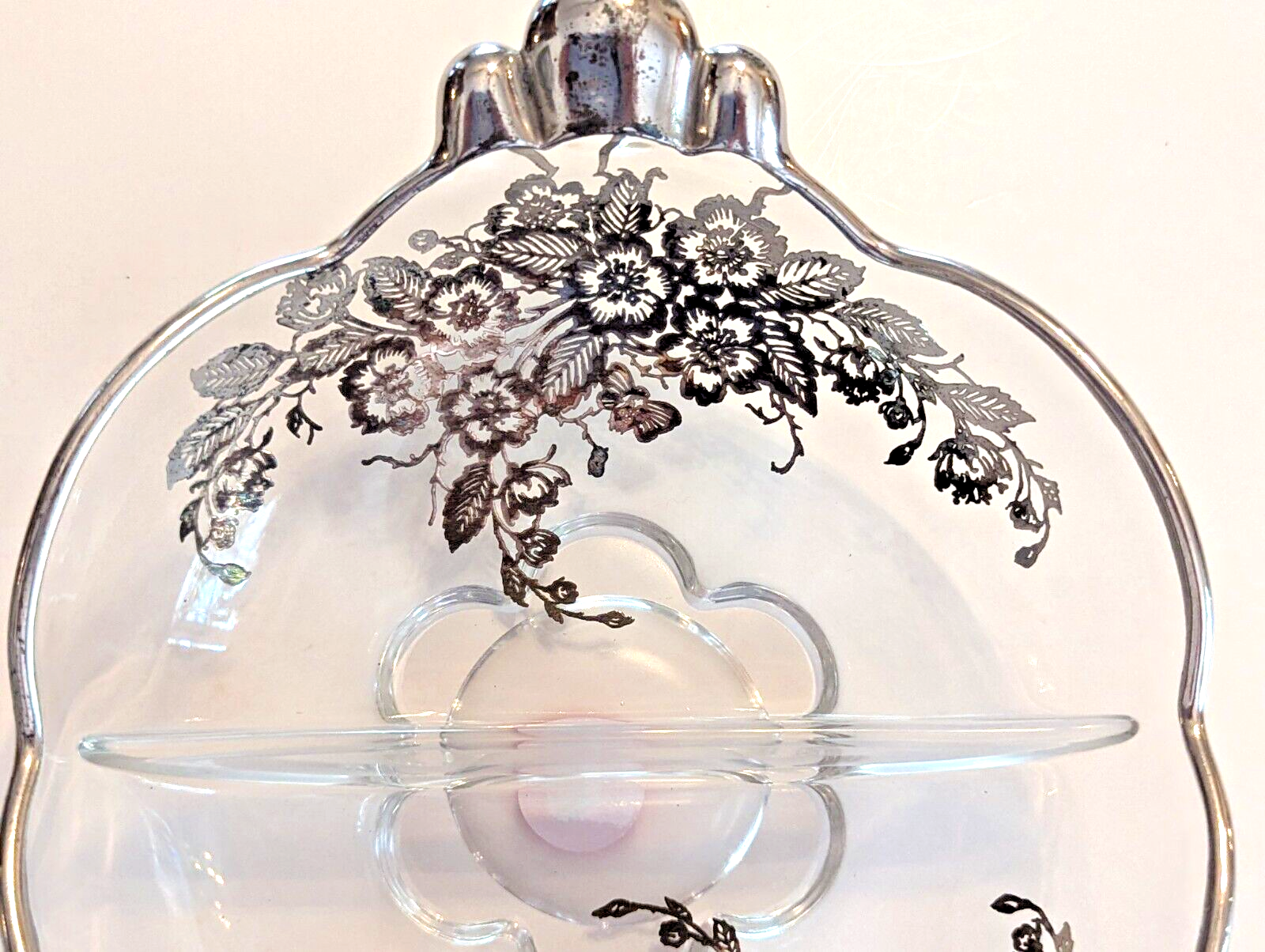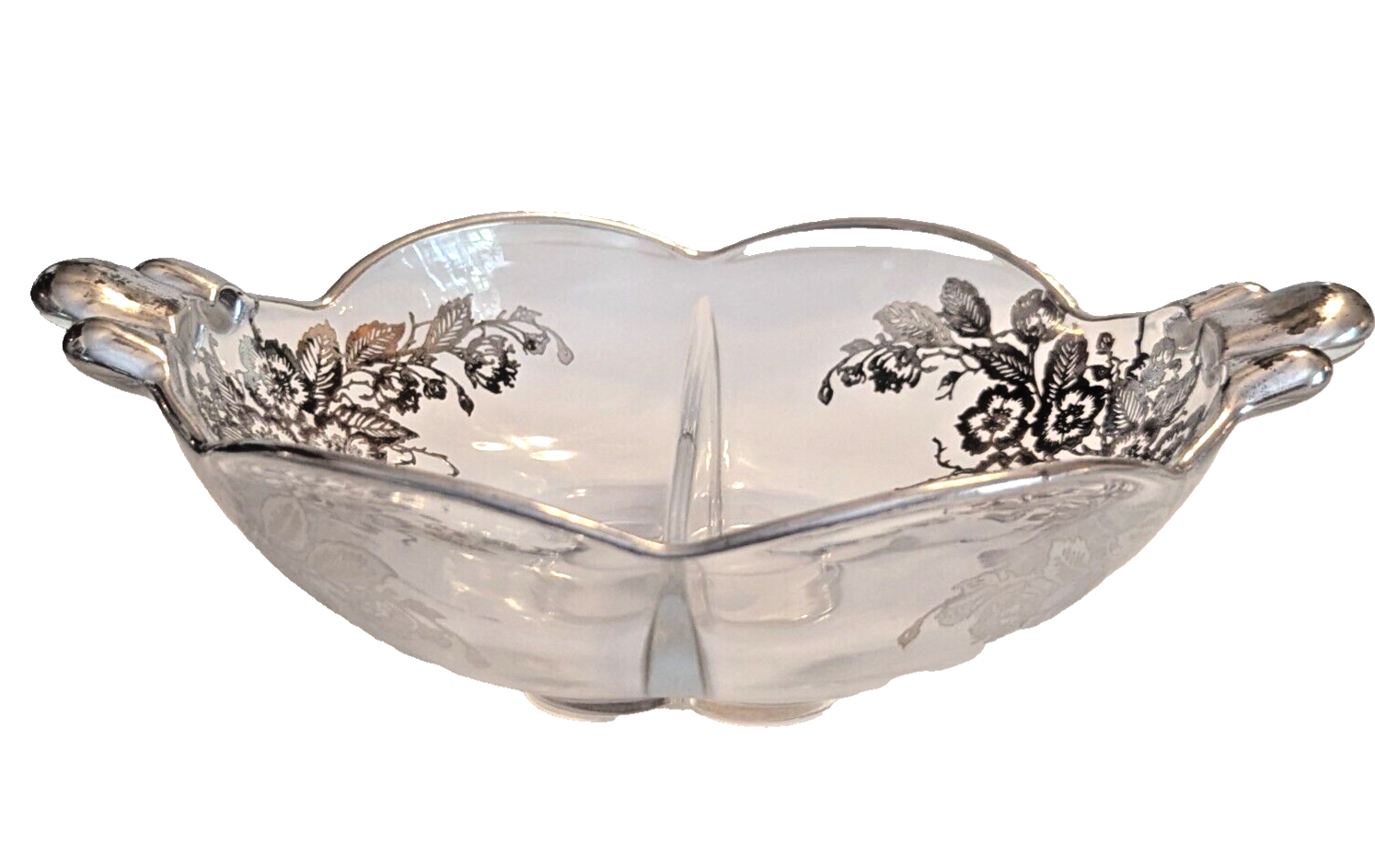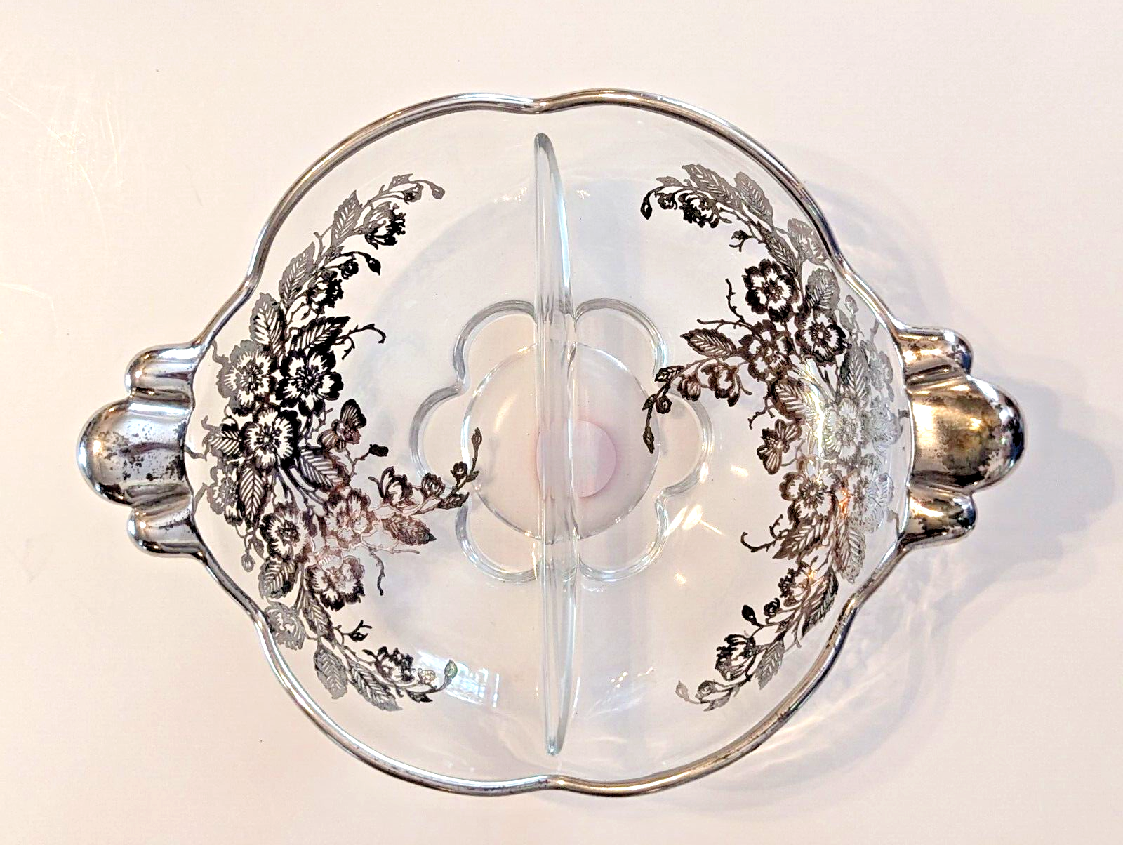 Duncan Miller Canterbury 2-part relish dish with the Blossom Time silver overlay by Silver City Glass.
