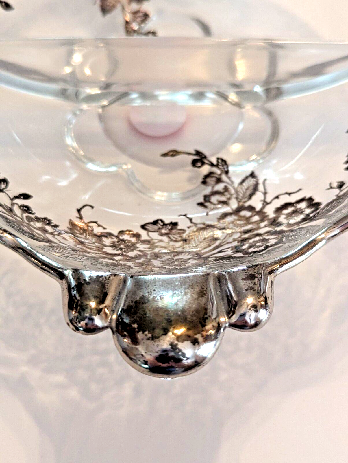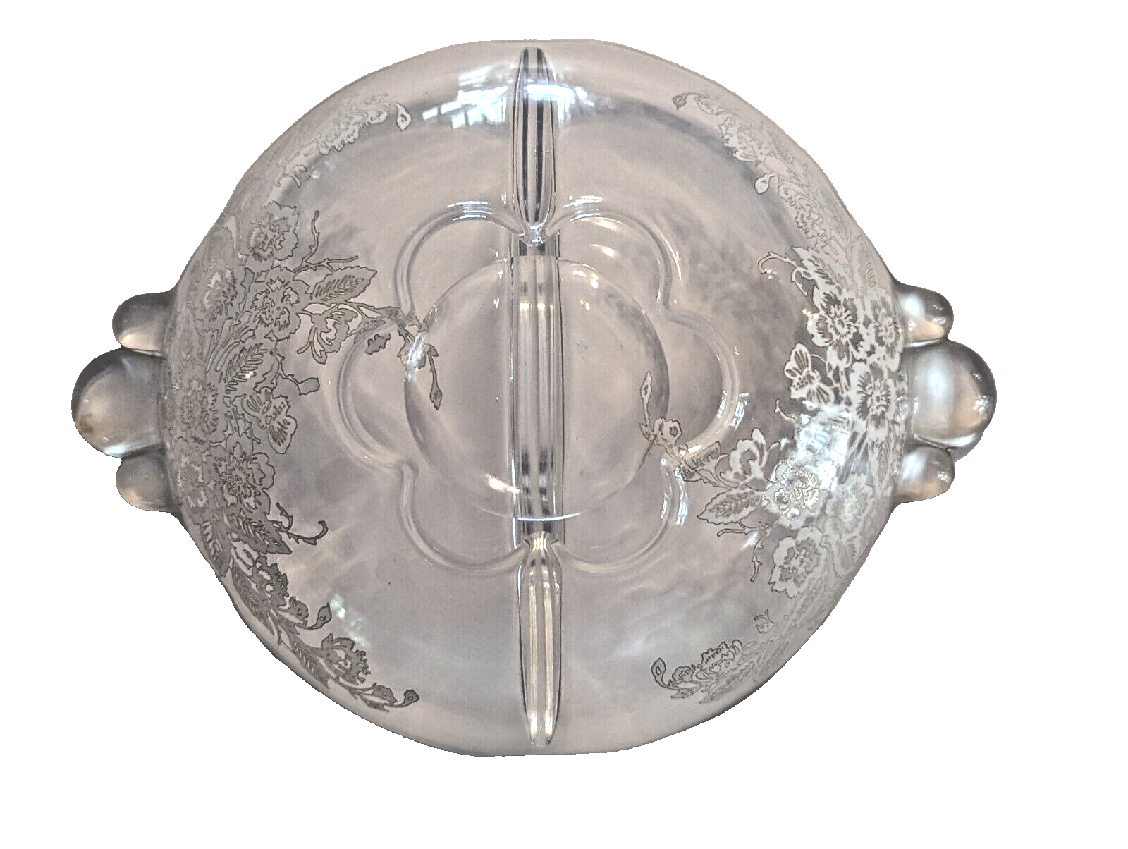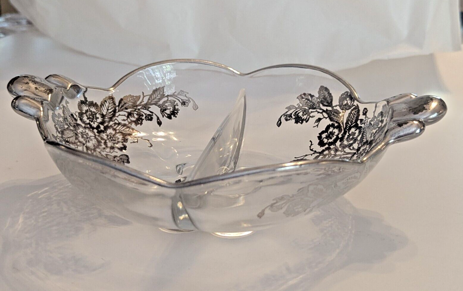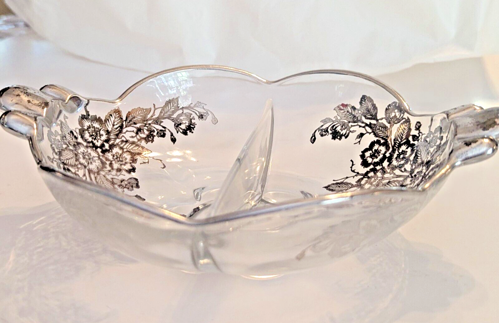 Duncan Miller Canterbury 2-part relish dish with the Blossom Time silver overlay by Silver City Glass.