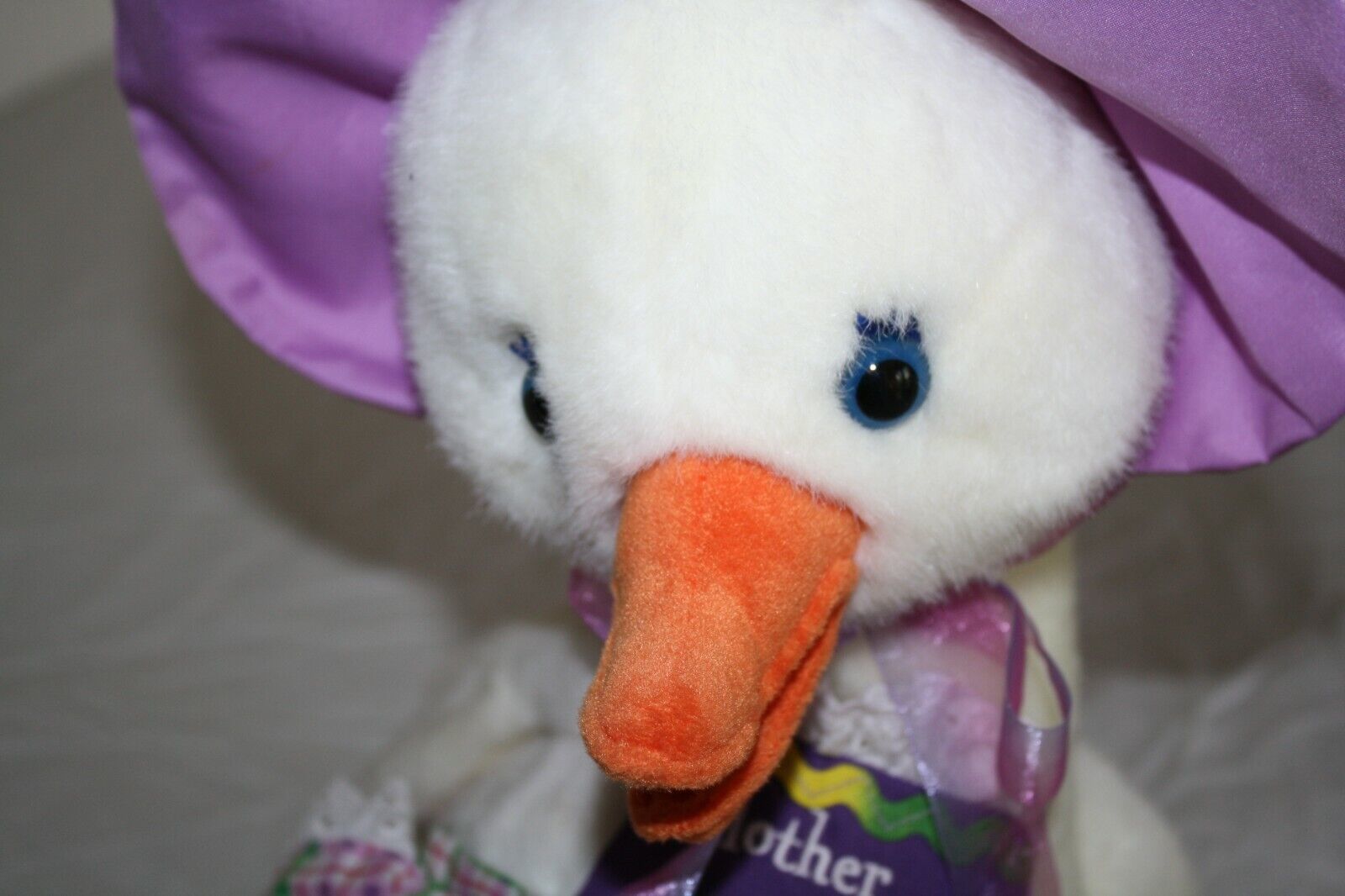 Features: Pretty Mother Goose wearing an attached purple bonnet hat tied at neck with ribbon, She is wearing an attached apron with a little elastic pocket on the front, Blue plastic eyes and plush beak, her feet and legs are orange soft plush material