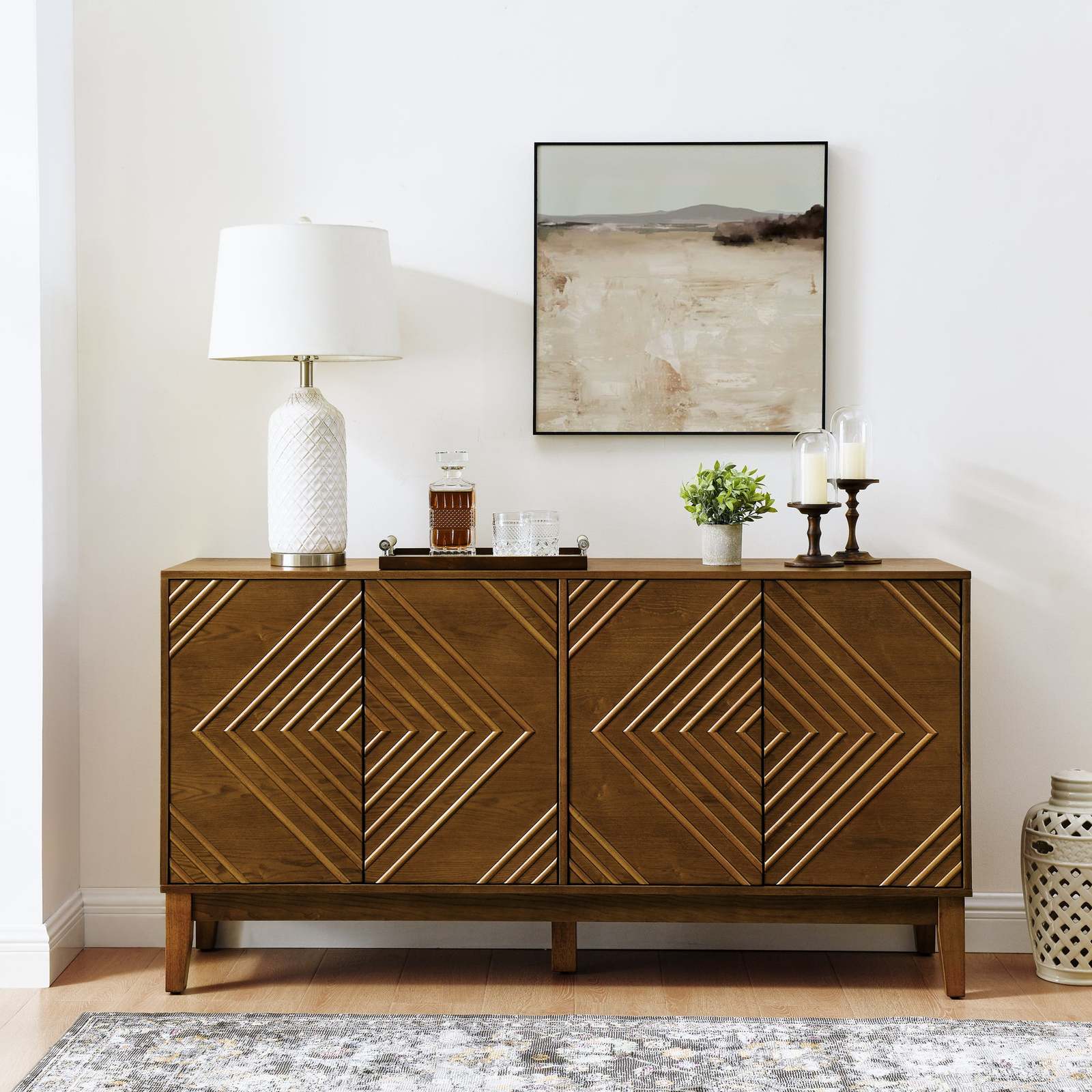 ?Modern Style with Vintage Charm?- Add a touch of vintage charm to your living room or dining area with this mid-century style sideboard. The 4 door panels feature a geometric pattern inlaid with multiple solid wood strips. The cabinet doors and are designed with hidden handles that can be opened by simply pressing the doors.